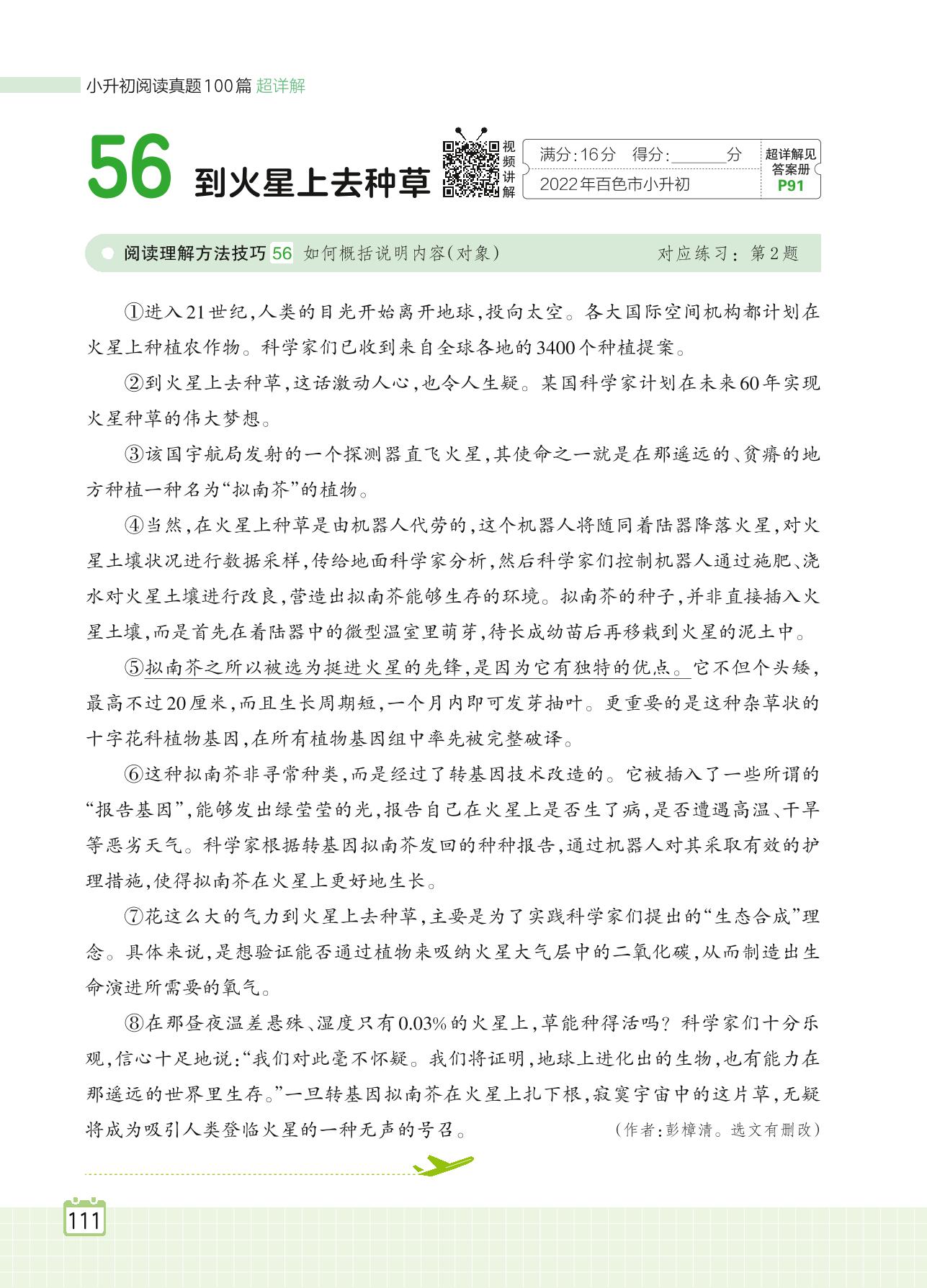 2024全一册六年级语文人教版 专题六 说明文 56 到火星上去种草