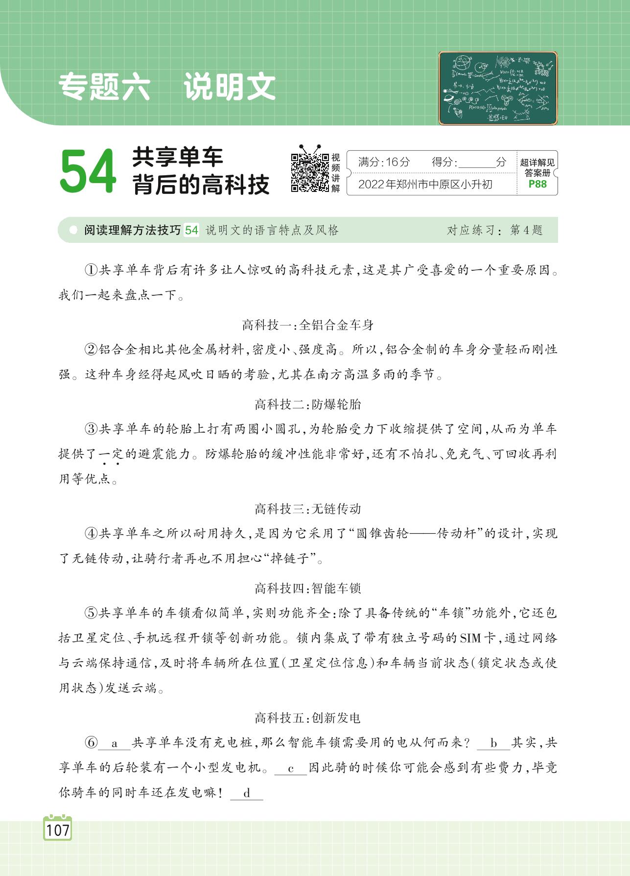 2024全一册六年级语文人教版 专题六 说明文 54 共享单车背后的高科技