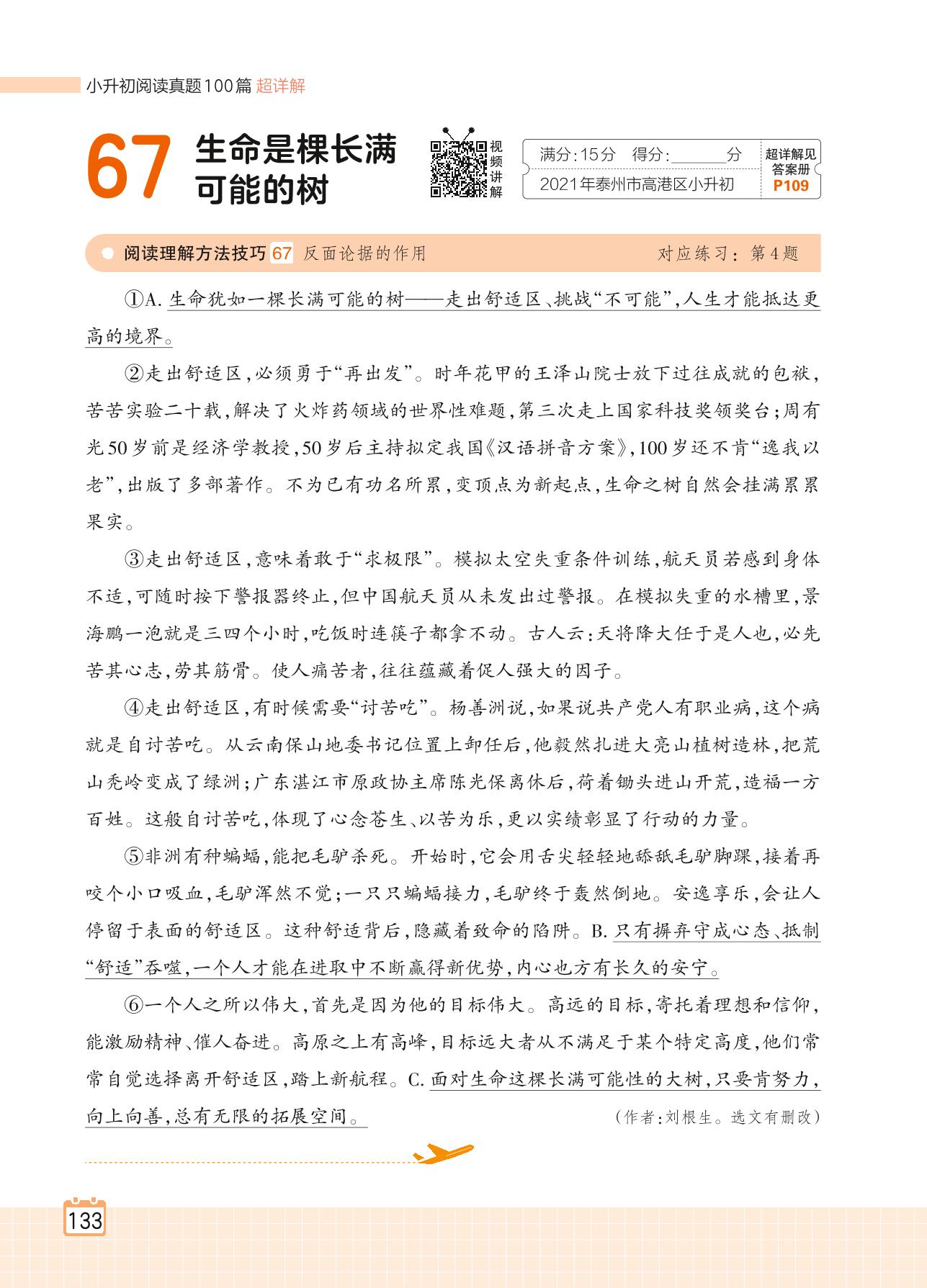 2024全一册六年级语文人教版 专题七 议论文 67 生命是棵长满可能的树