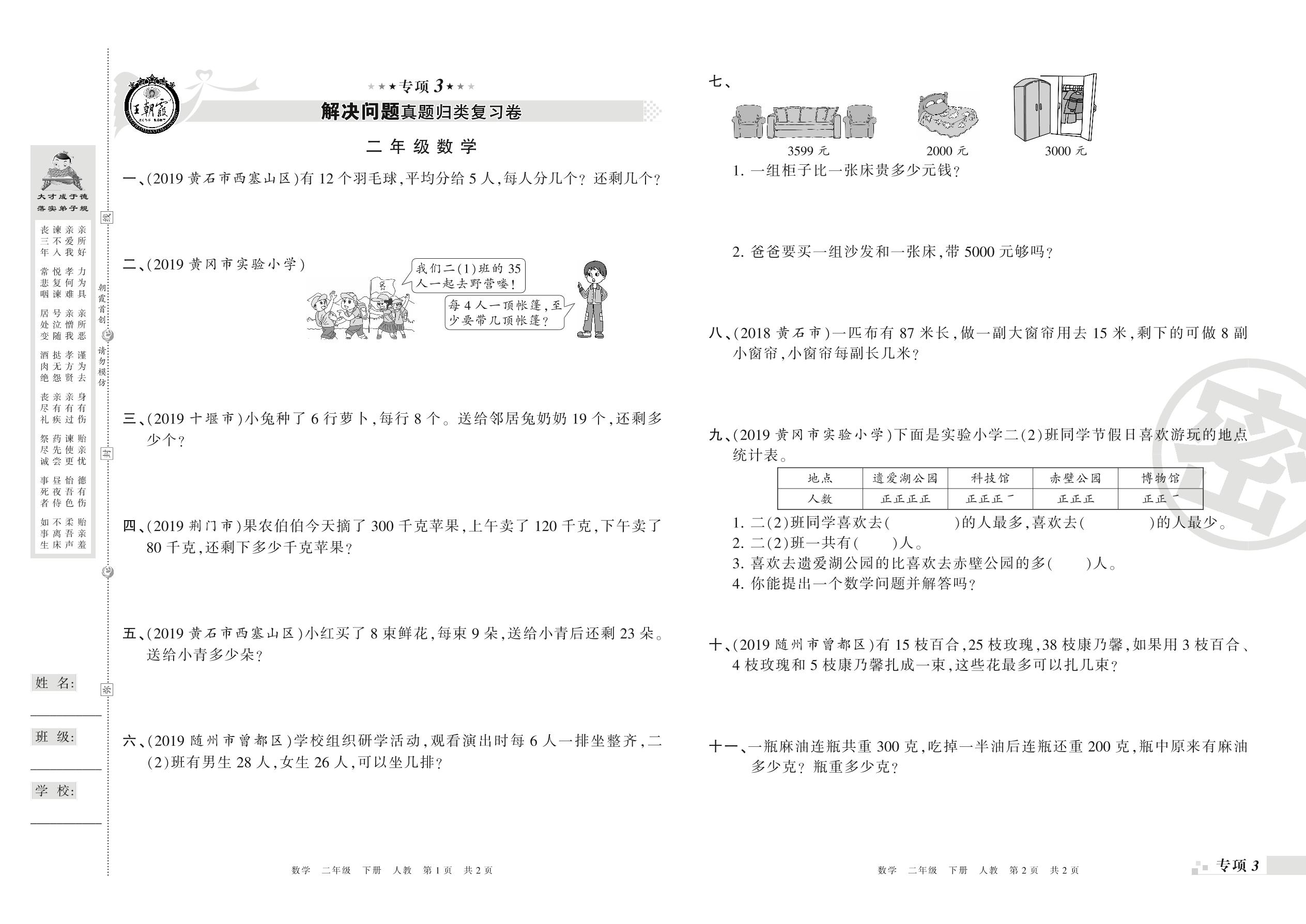 王朝霞期末专项卷——解决问题真题归类复习卷、新颖题速递:生活与数学二年级下册数学(人教版)_R21080390949【0】
