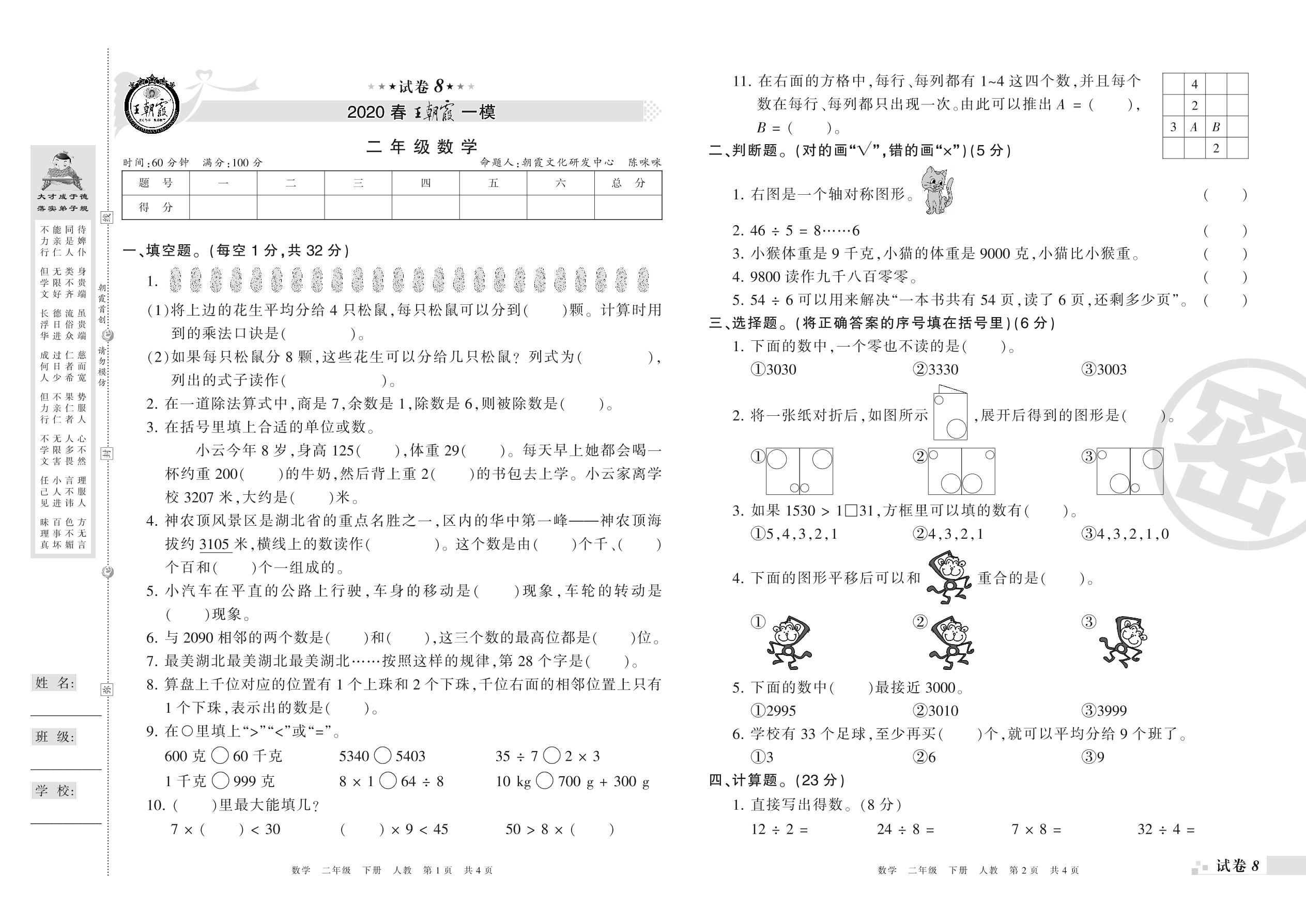 王朝霞期末模拟卷二年级下册数学(人教版)_R21080391016【8】