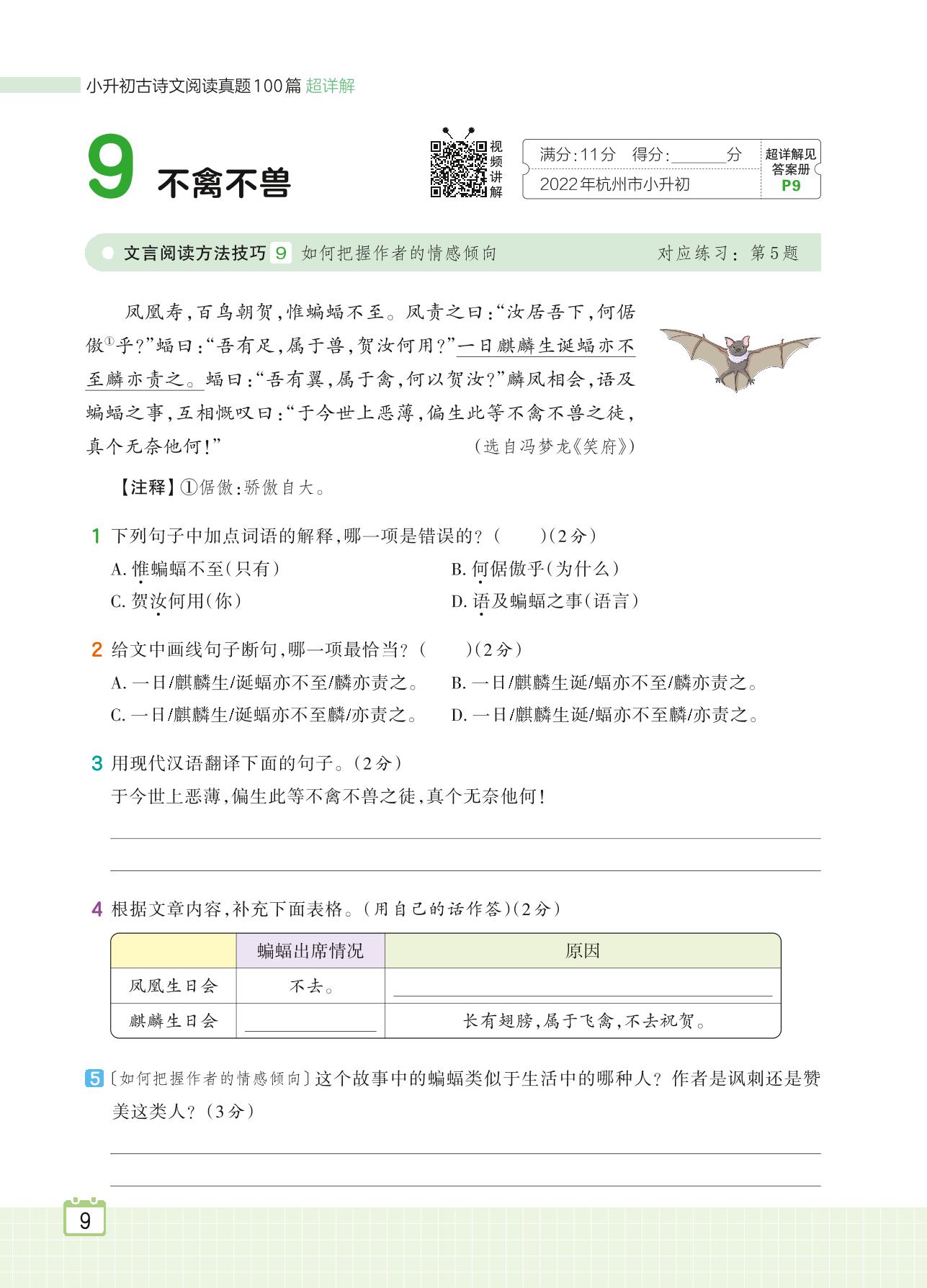 2024全一册六年级语文人教版 专题一 寓事说理 9 不禽不兽