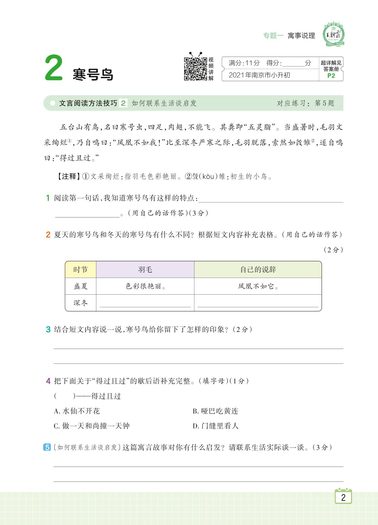 2024全一册六年级语文人教版 专题一 寓事说理 2 寒号鸟
