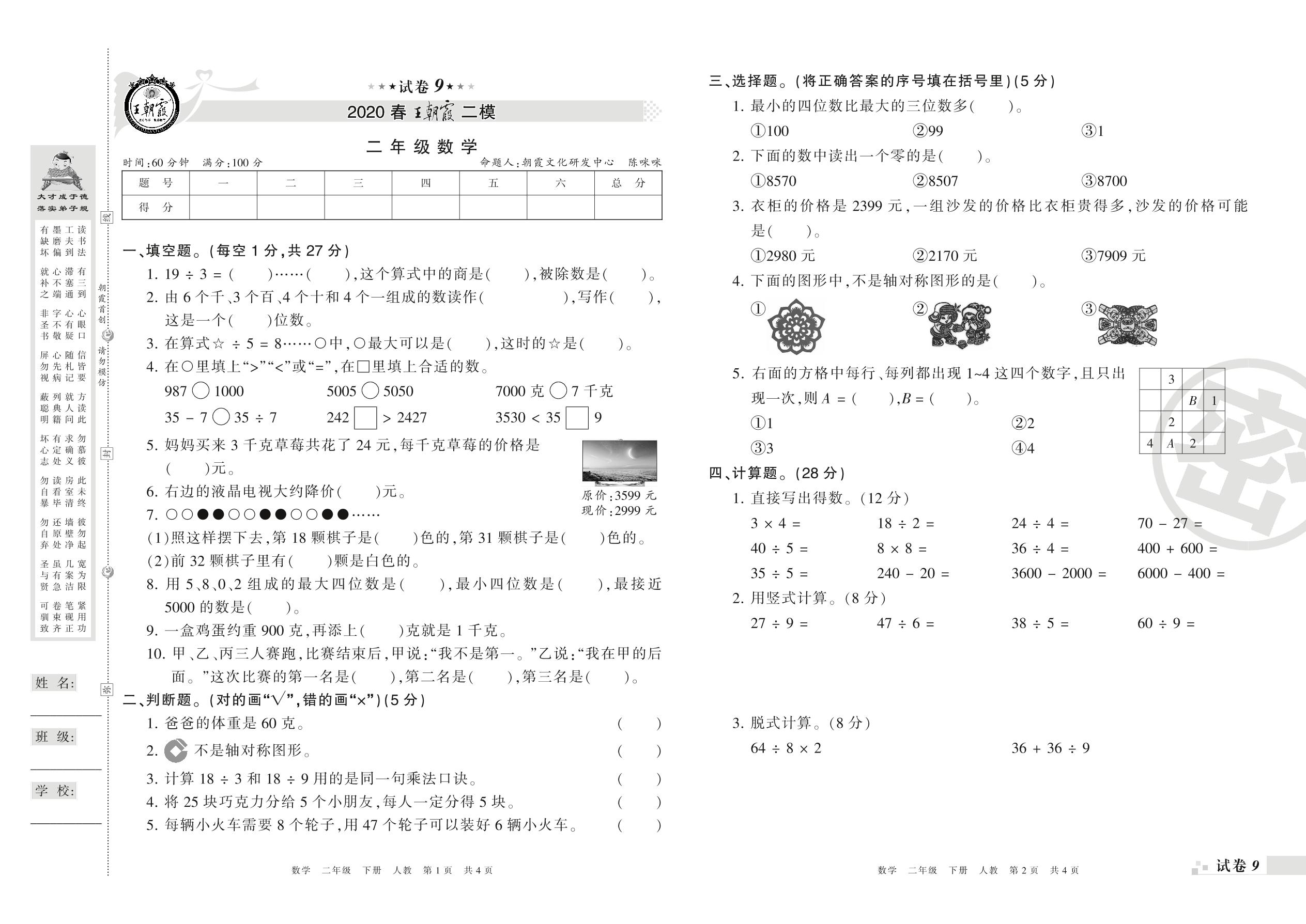 王朝霞期末模拟卷二年级下册数学(人教版)_R21080391022【9】