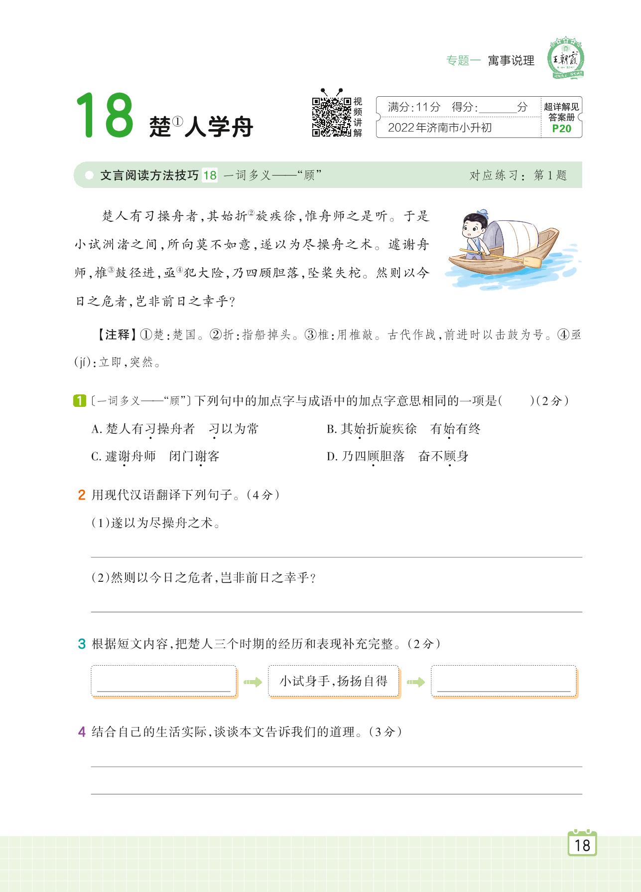 2024全一册六年级语文人教版 专题一 寓事说理 18 楚人学舟