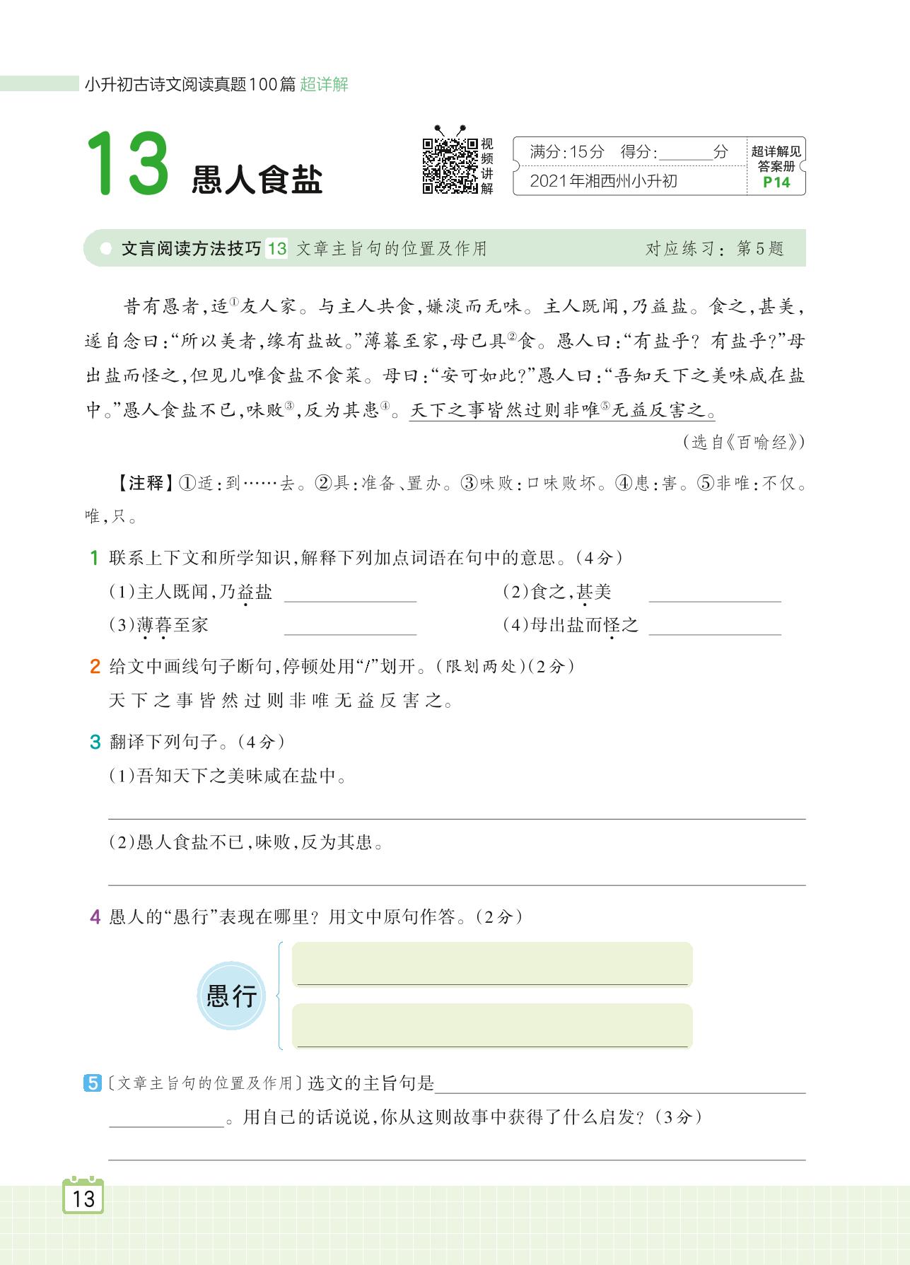 2024全一册六年级语文人教版 专题一 寓事说理 13 愚人食盐