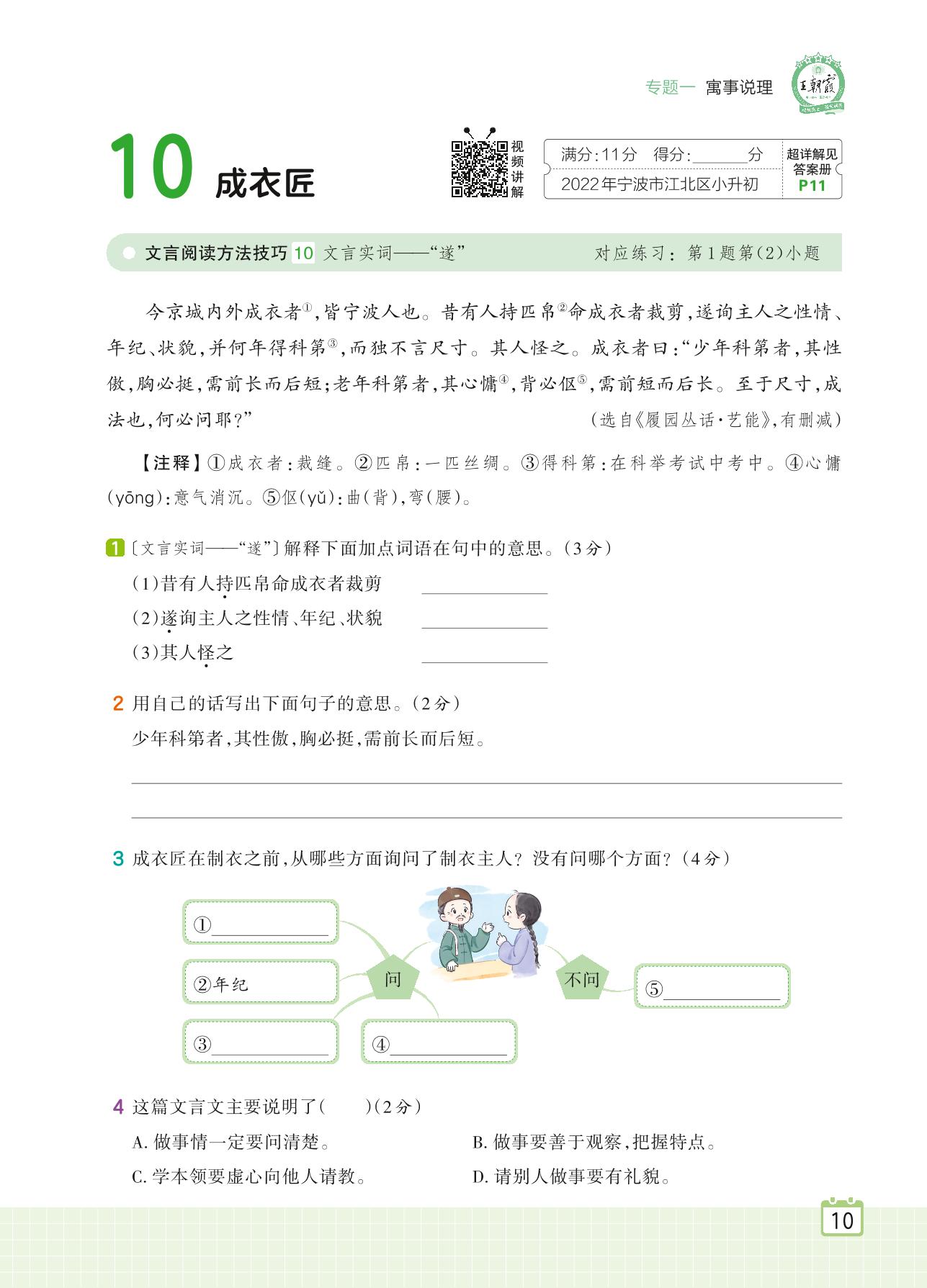 2024全一册六年级语文人教版 专题一 寓事说理 10 成衣匠