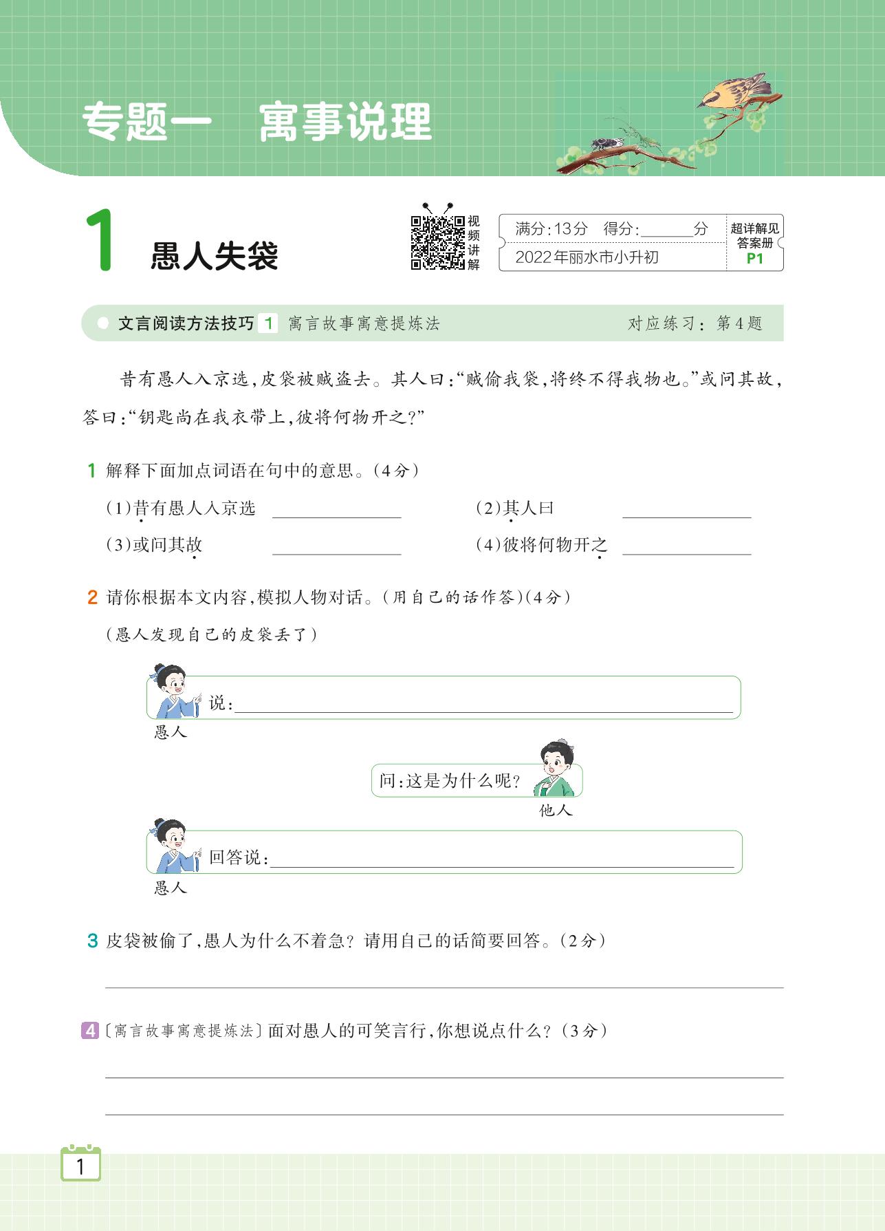2024全一册六年级语文人教版 专题一 寓事说理 1 愚人失袋