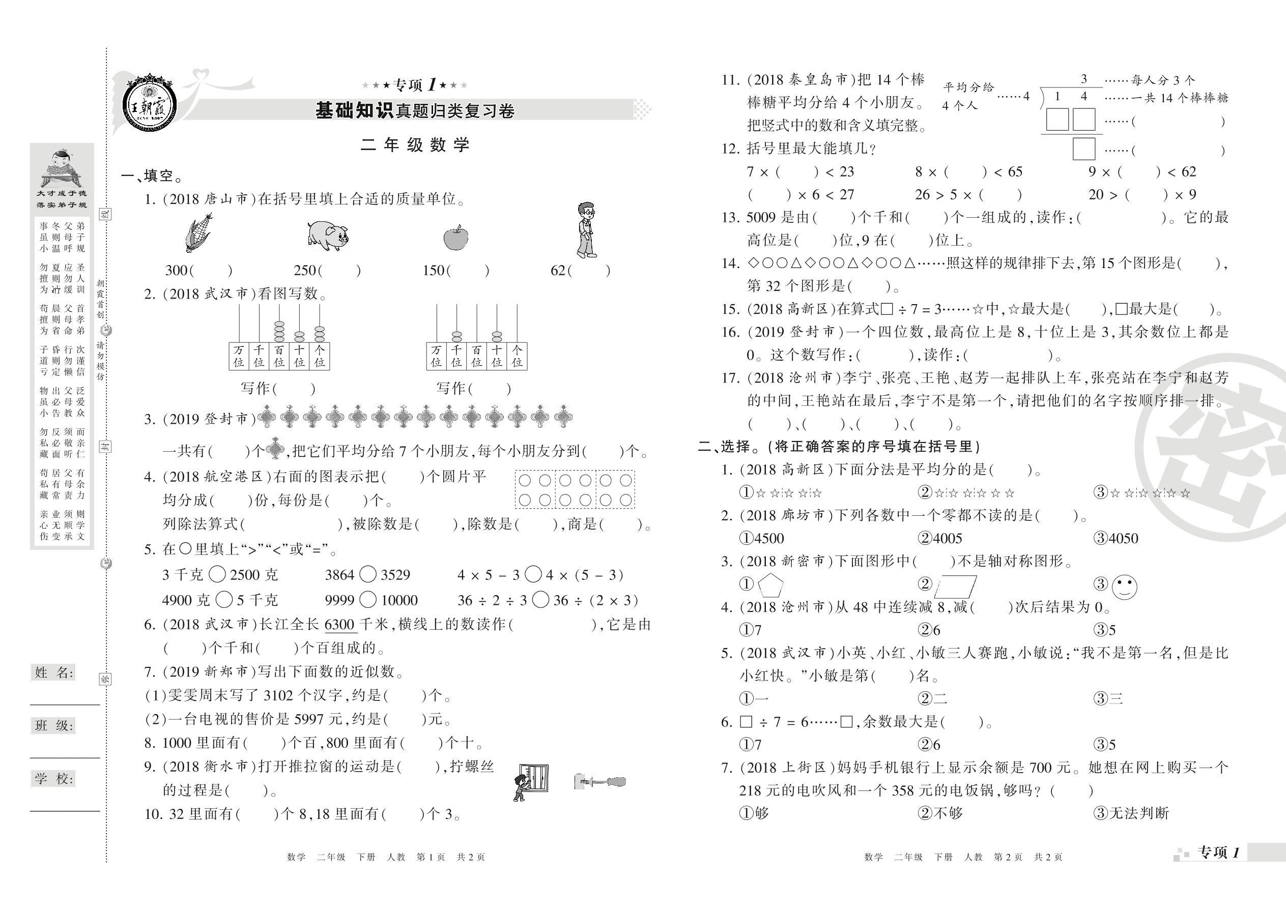 王朝霞期末专项卷——基础知识、计算真题归类复习卷二年级下册数学(人教版)_R21080391033【0】