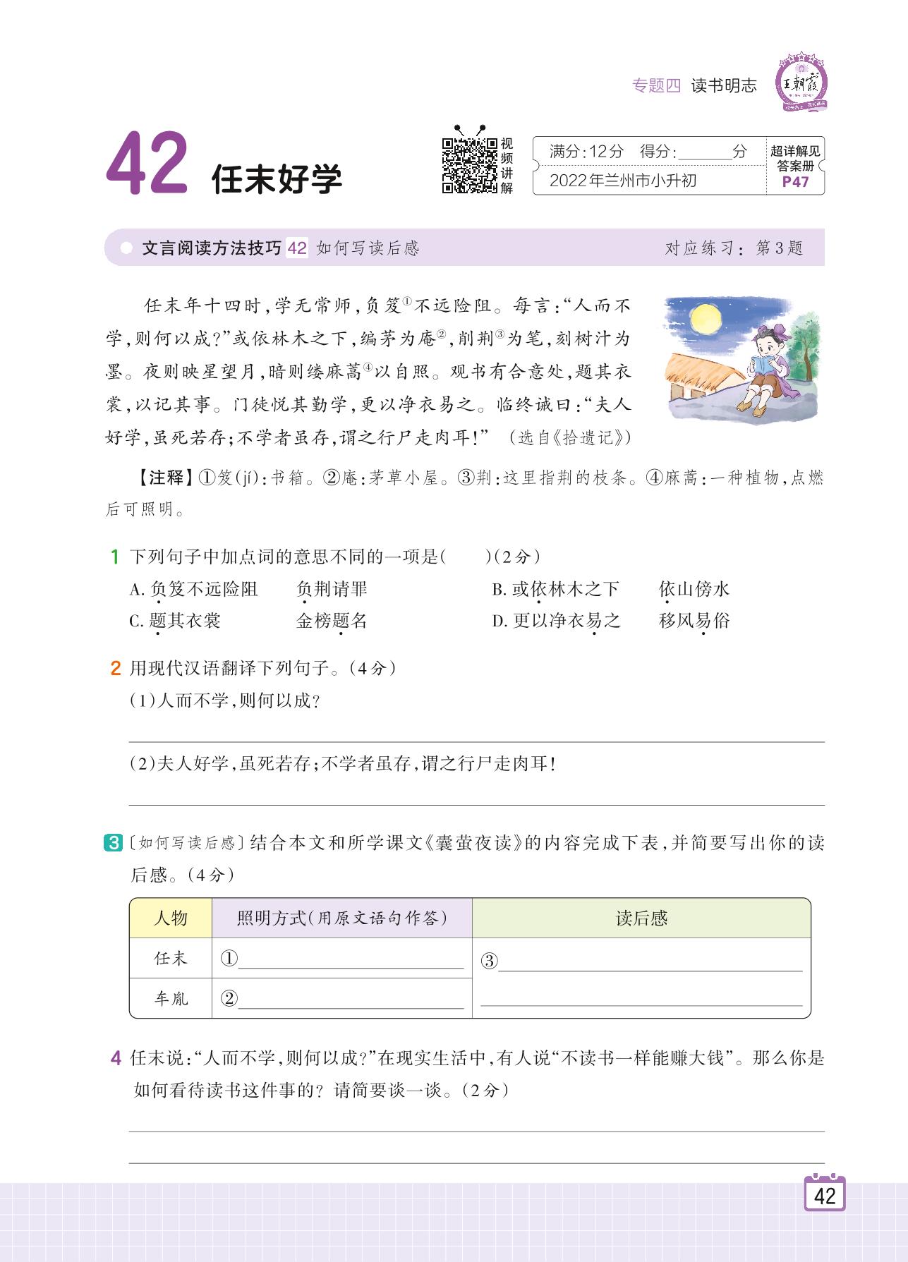 2024全一册六年级语文人教版 专题四 读书明志 42 任末好学