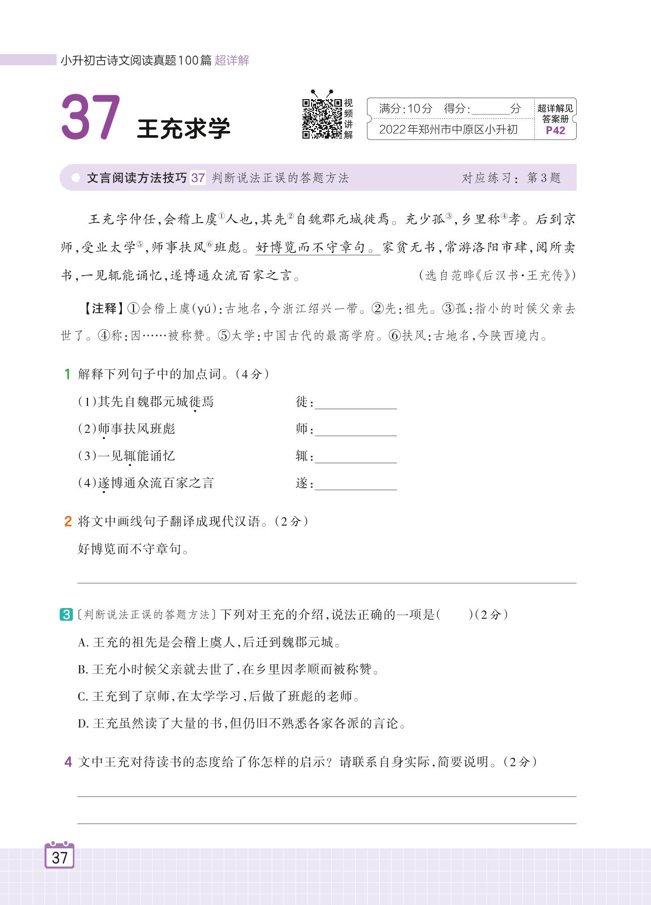 2024全一册六年级语文人教版 专题四 读书明志 37 王充求学