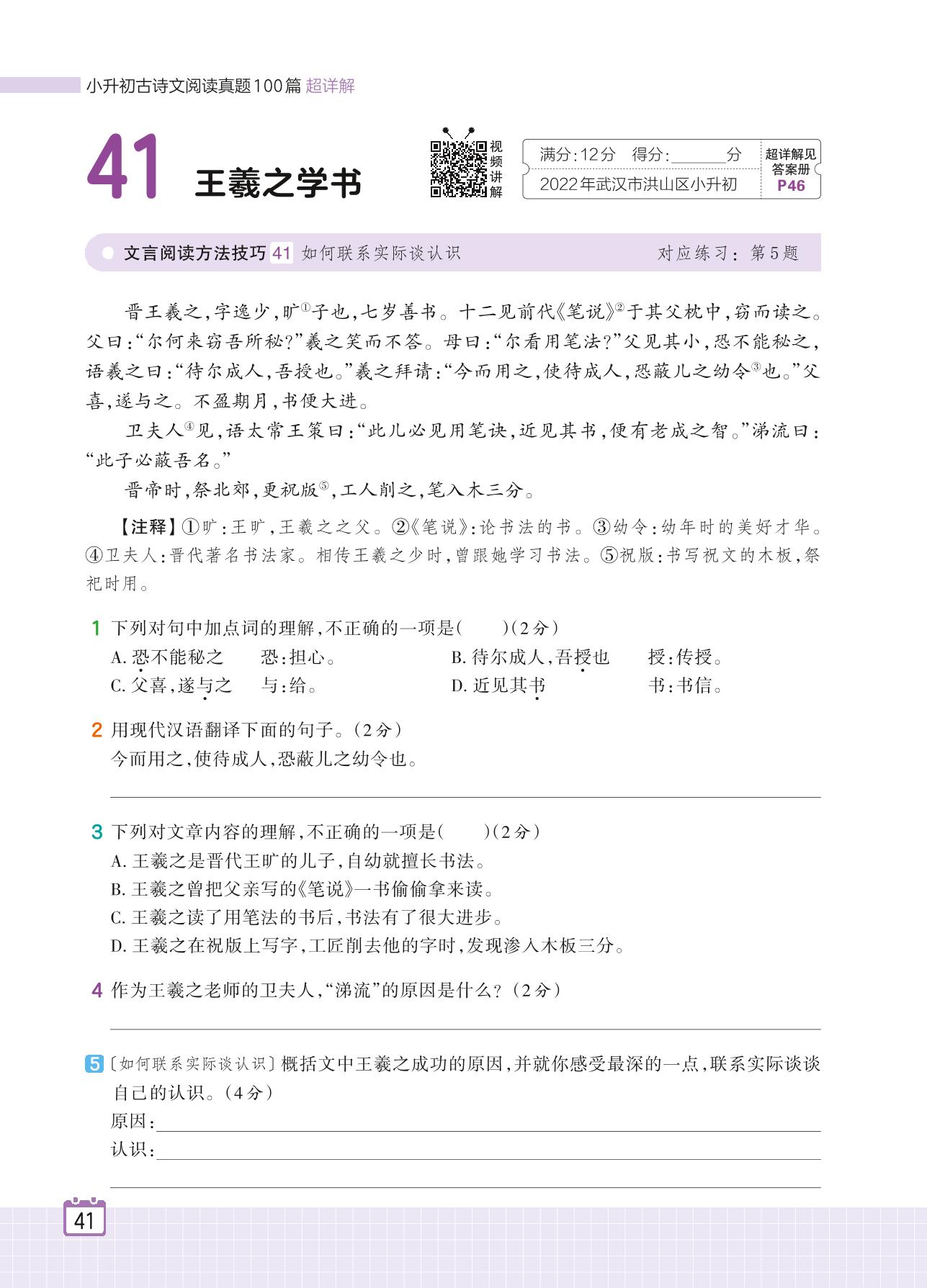 2024全一册六年级语文人教版 专题四 读书明志 41 王羲之学书
