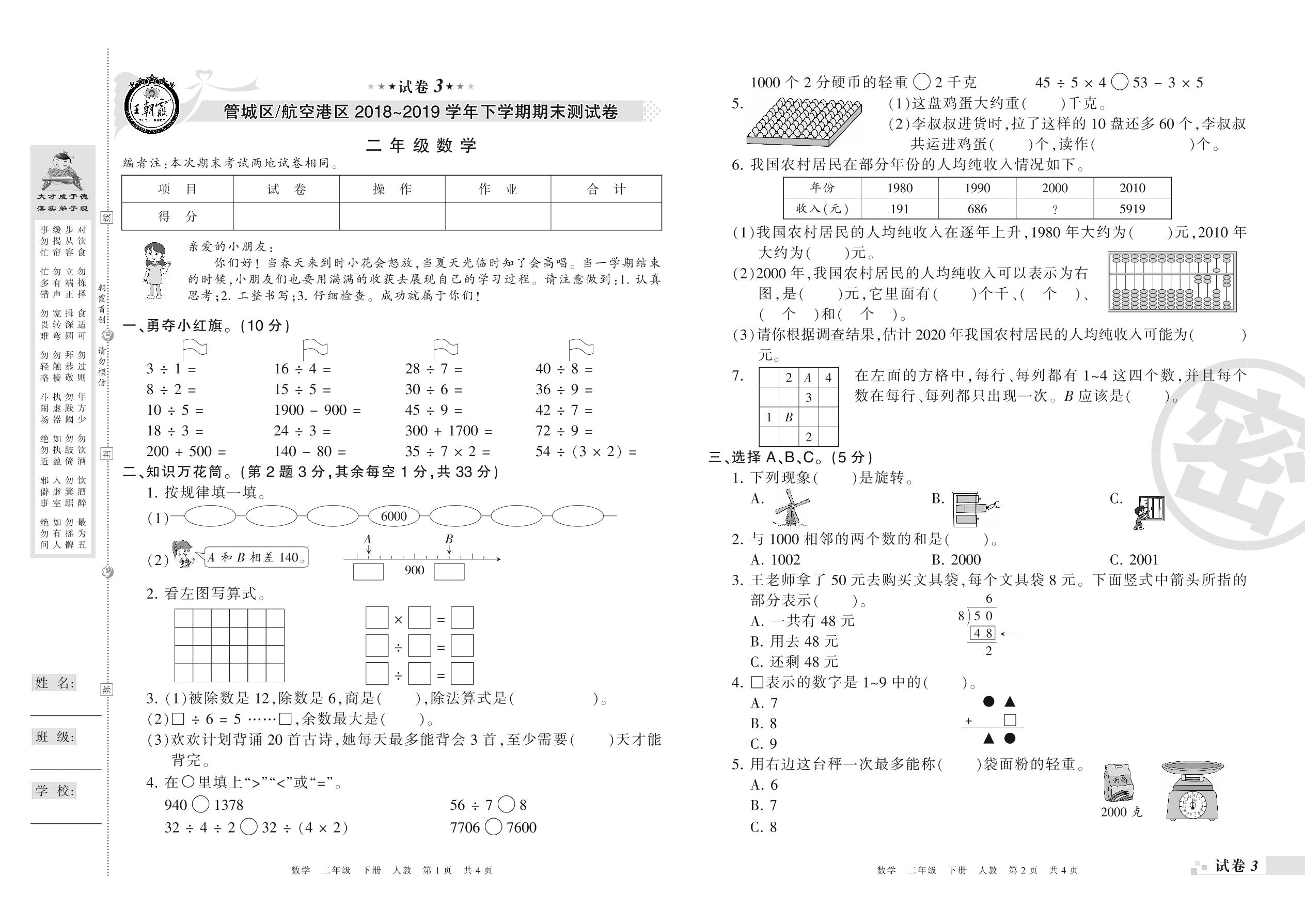 2018-2019学年第二学期郑州市管城区、航空港区二年级数学试卷(人教版)【3】