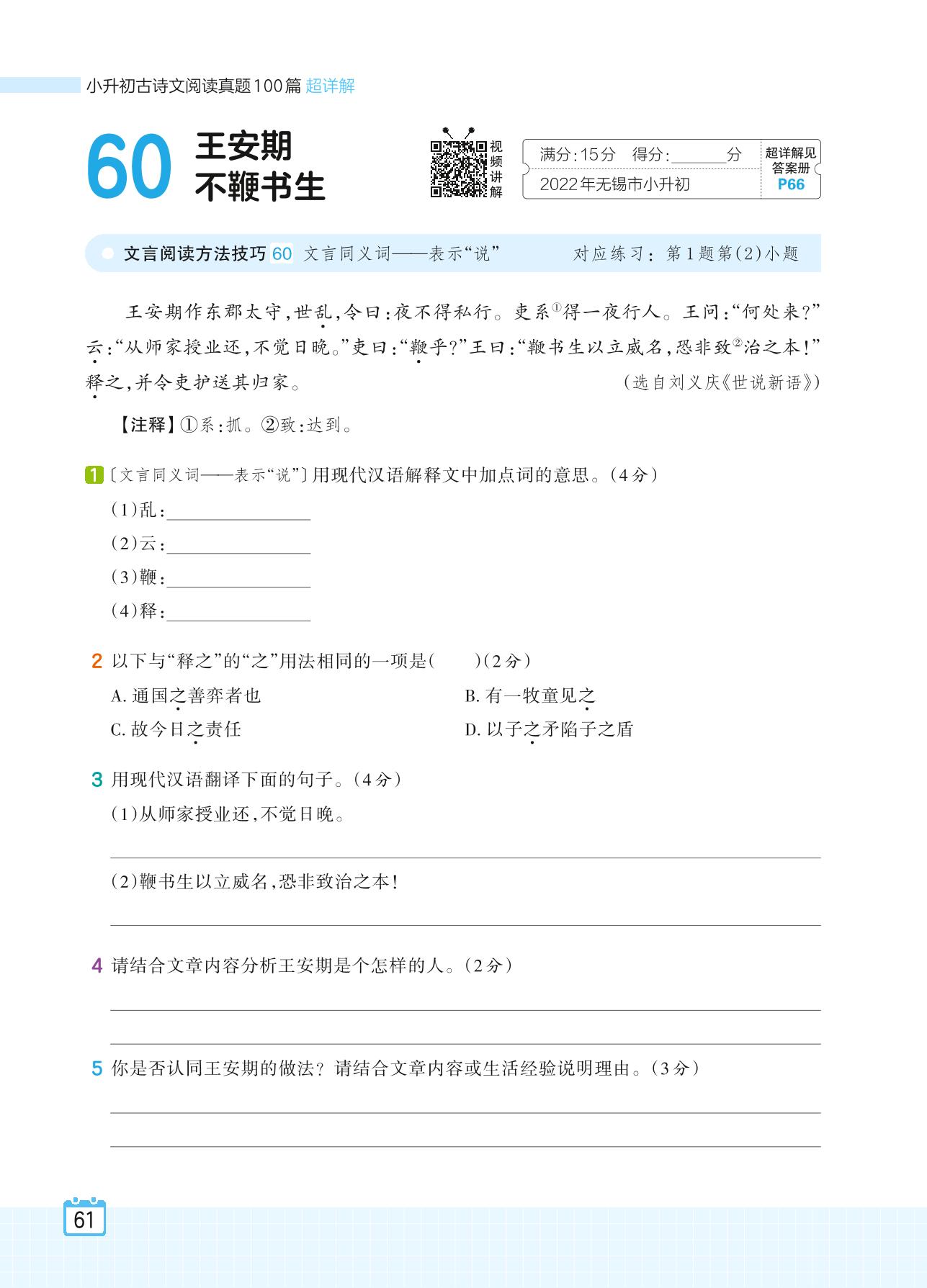 2024全一册六年级语文人教版 专题五 美好品质 60 王安期不鞭书生