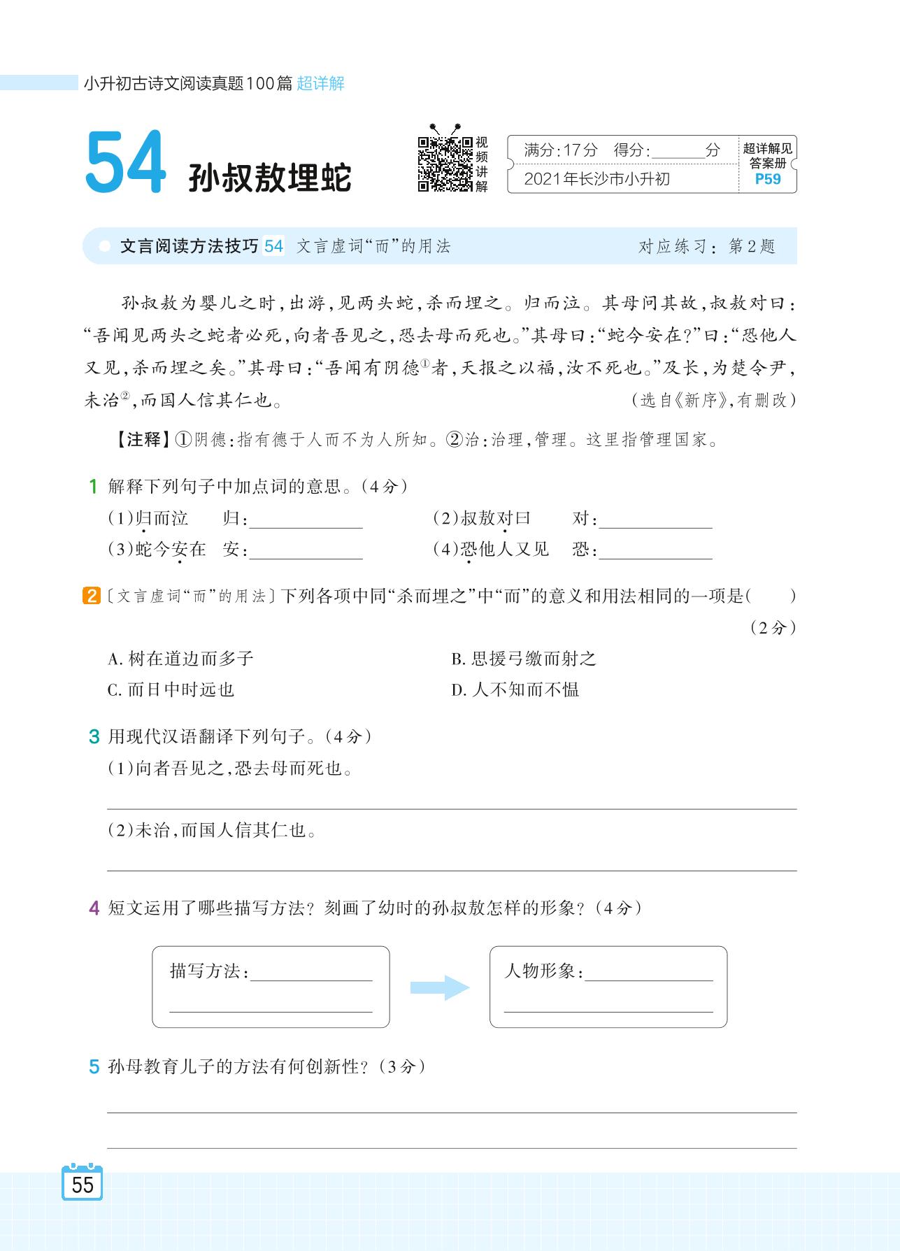 2024全一册六年级语文人教版 专题五 美好品质 54 孙叔敖埋蛇