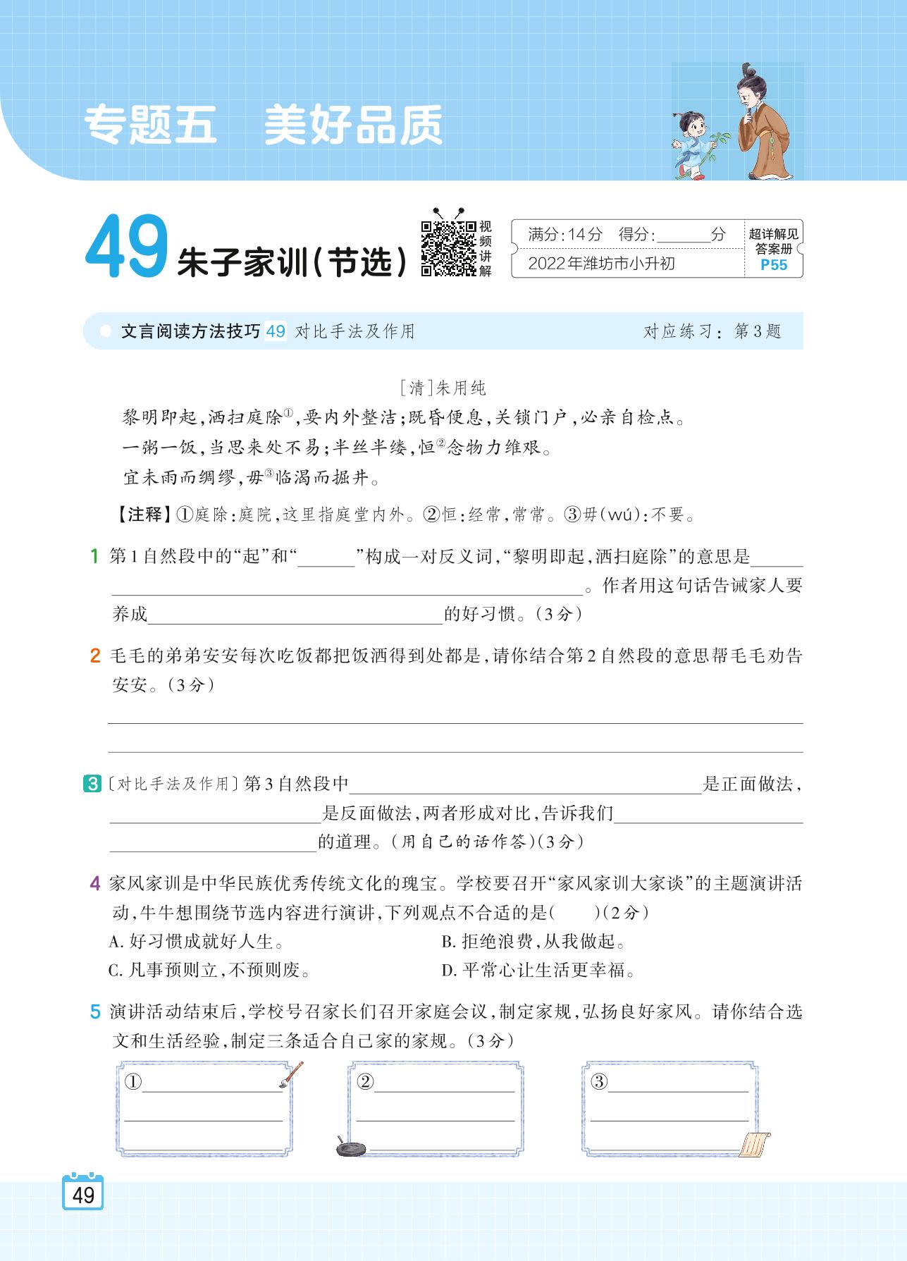 2024全一册六年级语文人教版 专题五 美好品质 49 朱子家训 (节选)