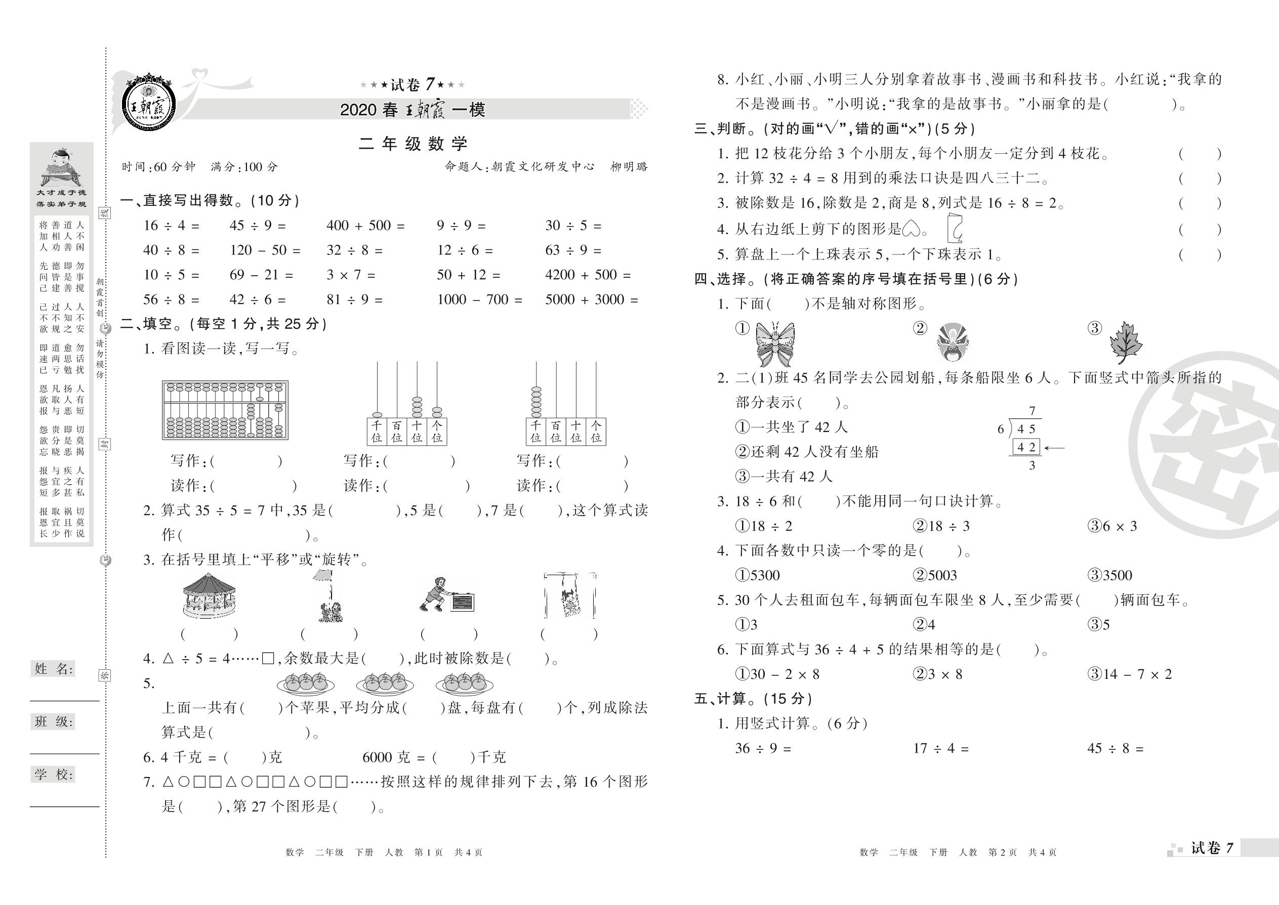王朝霞期末模拟卷二年级下册数学(人教版)_R21080391103【7】