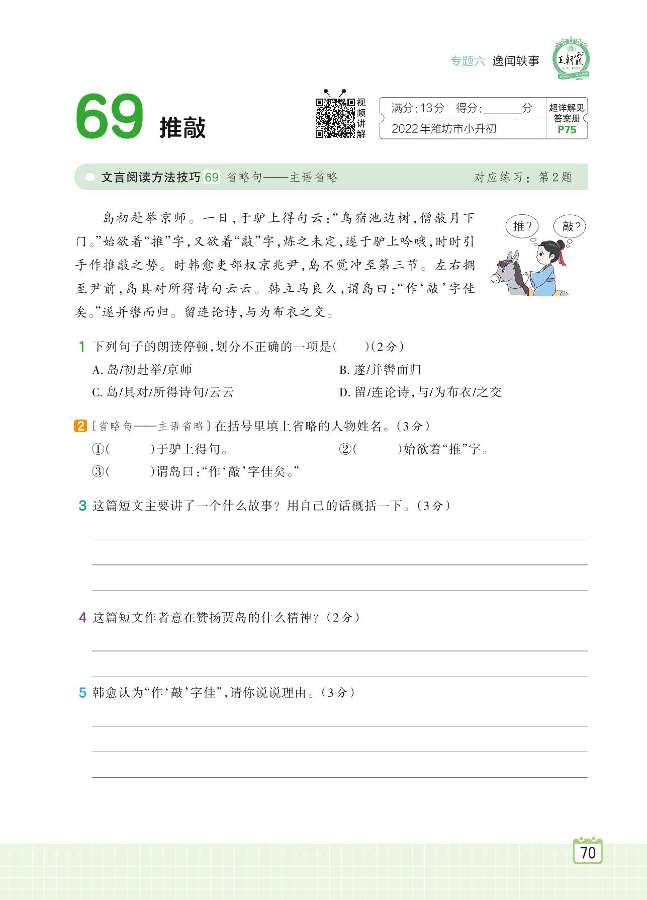 2024全一册六年级语文人教版 专题六 逸闻轶事 69 推敲