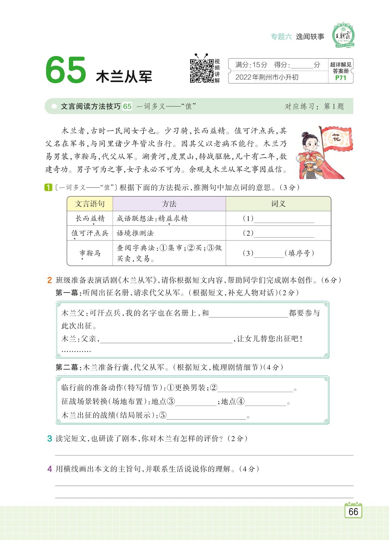 2024全一册六年级语文人教版 专题六 逸闻轶事 65 木兰从军