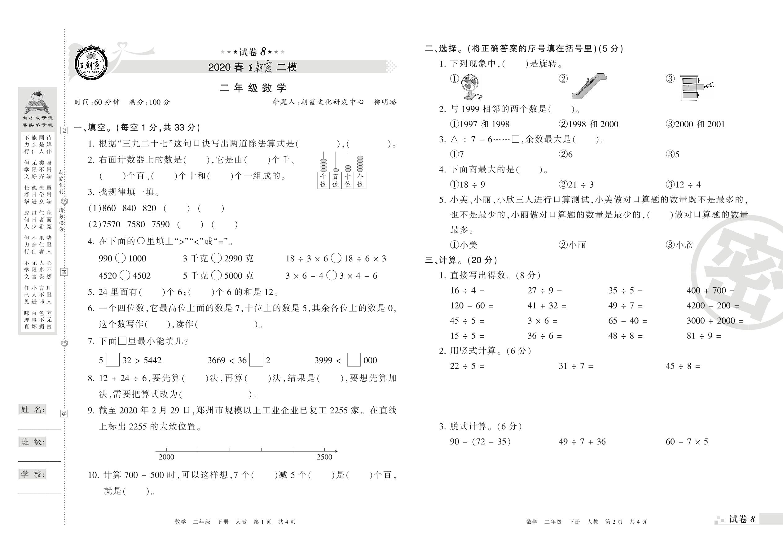 王朝霞期末模拟卷二年级下册数学(人教版)_R21080391108【8】