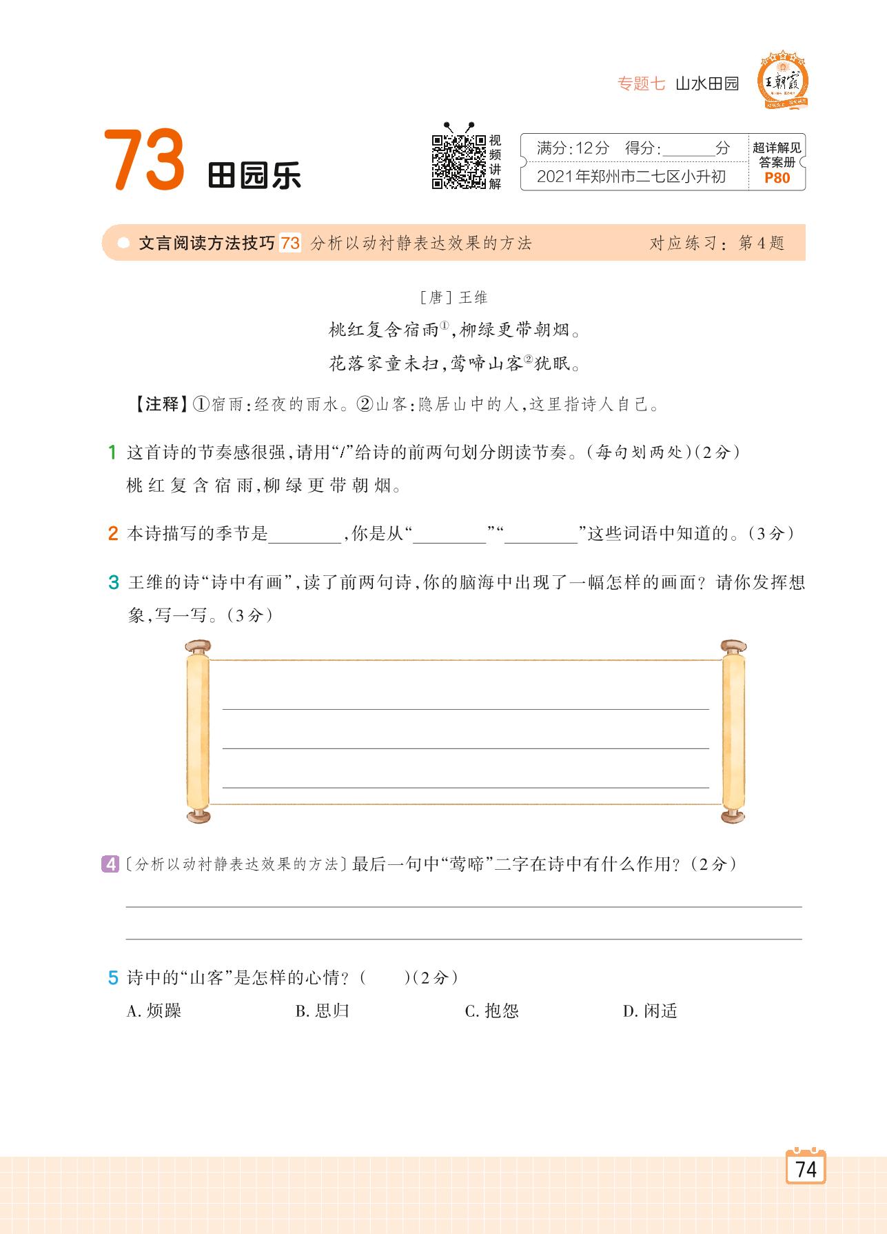 2024全一册六年级语文人教版 专题七 山水田园 73 田园乐