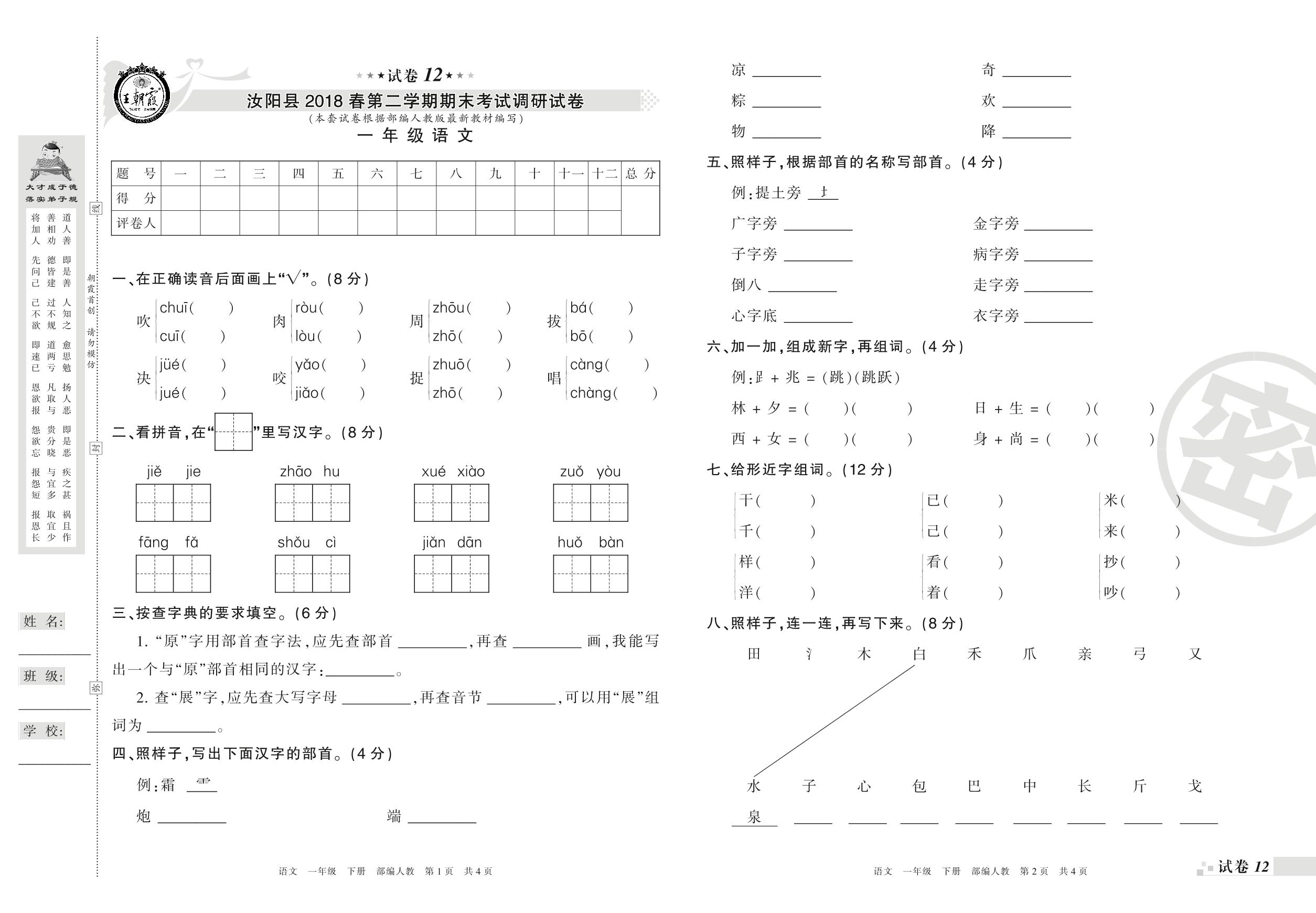 一年级语文人教版下册期末卷