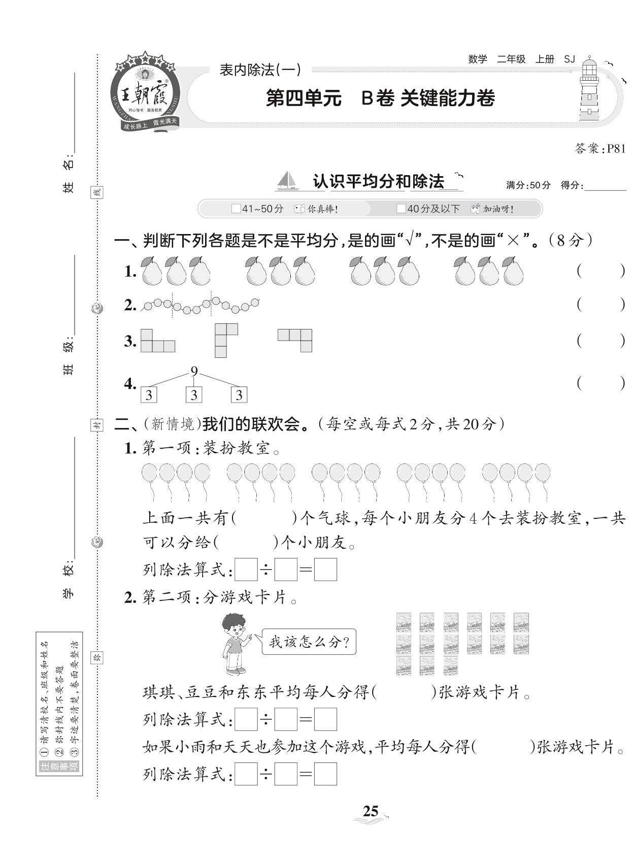 2023上册二年级数学苏教版 第四单元 B卷 关键能力卷