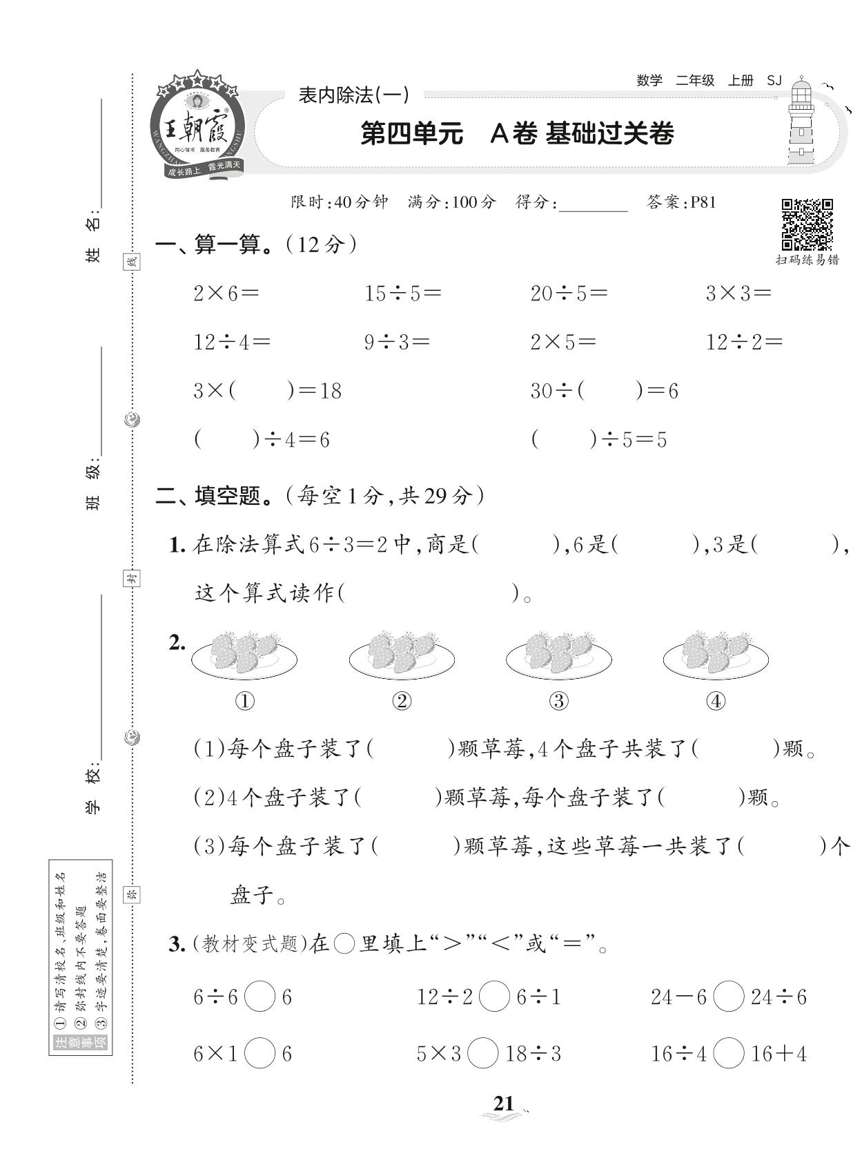 2023上册二年级数学苏教版 第四单元 A卷 基础过关卷
