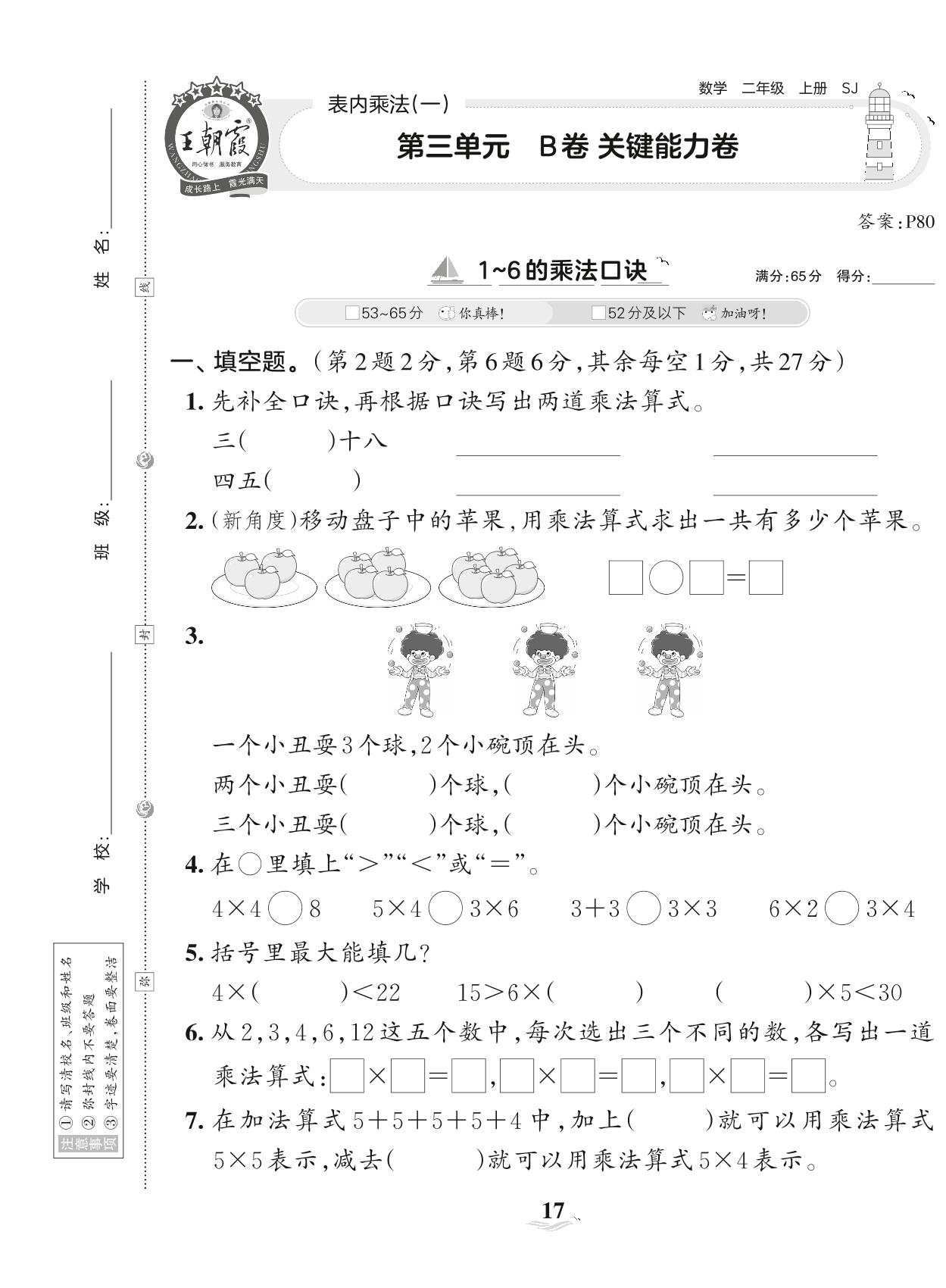 2023上册二年级数学苏教版 第三单元 B卷 关键能力卷
