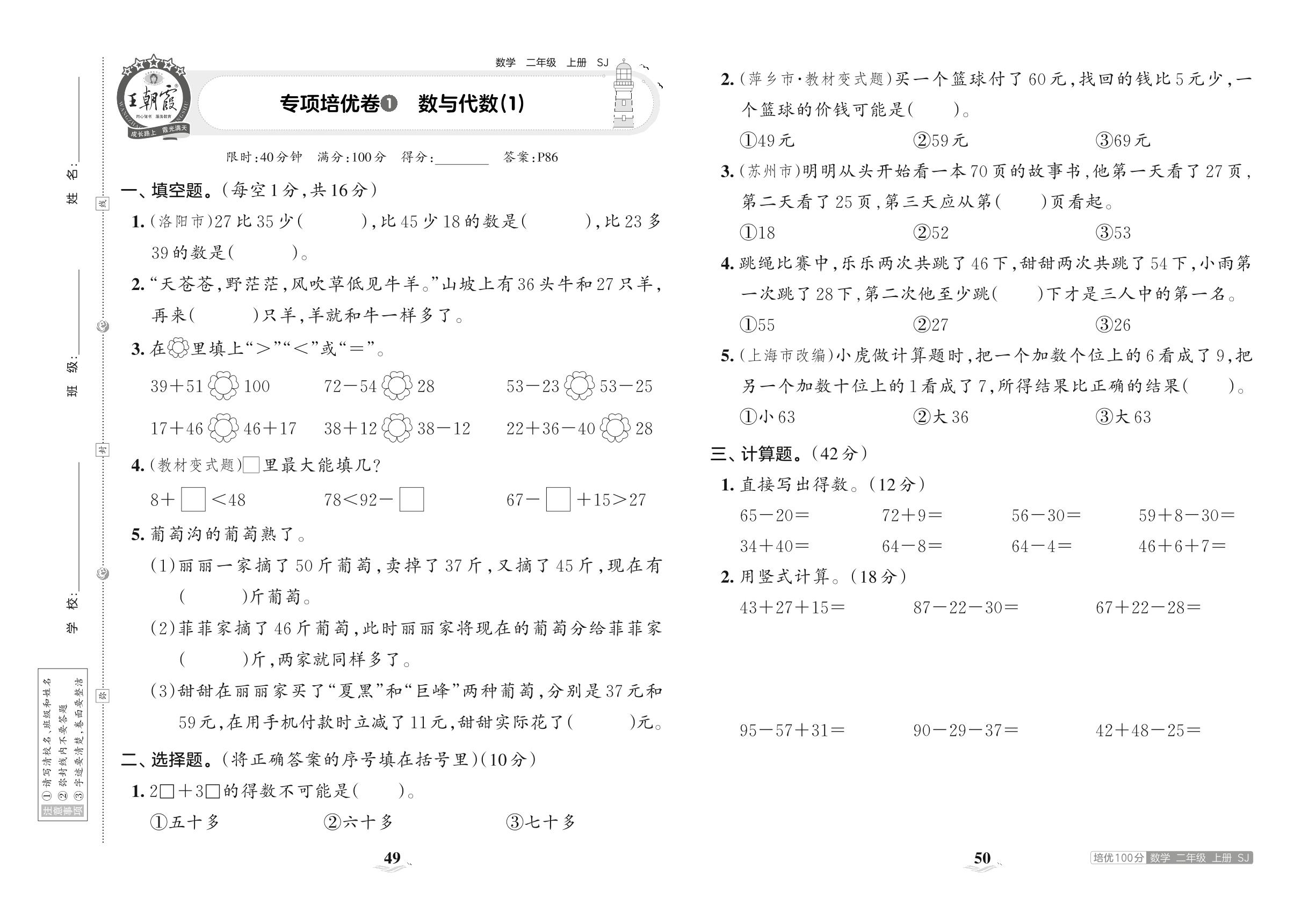2023上册二年级数学苏教版 专项培优卷1 数与代数(1)