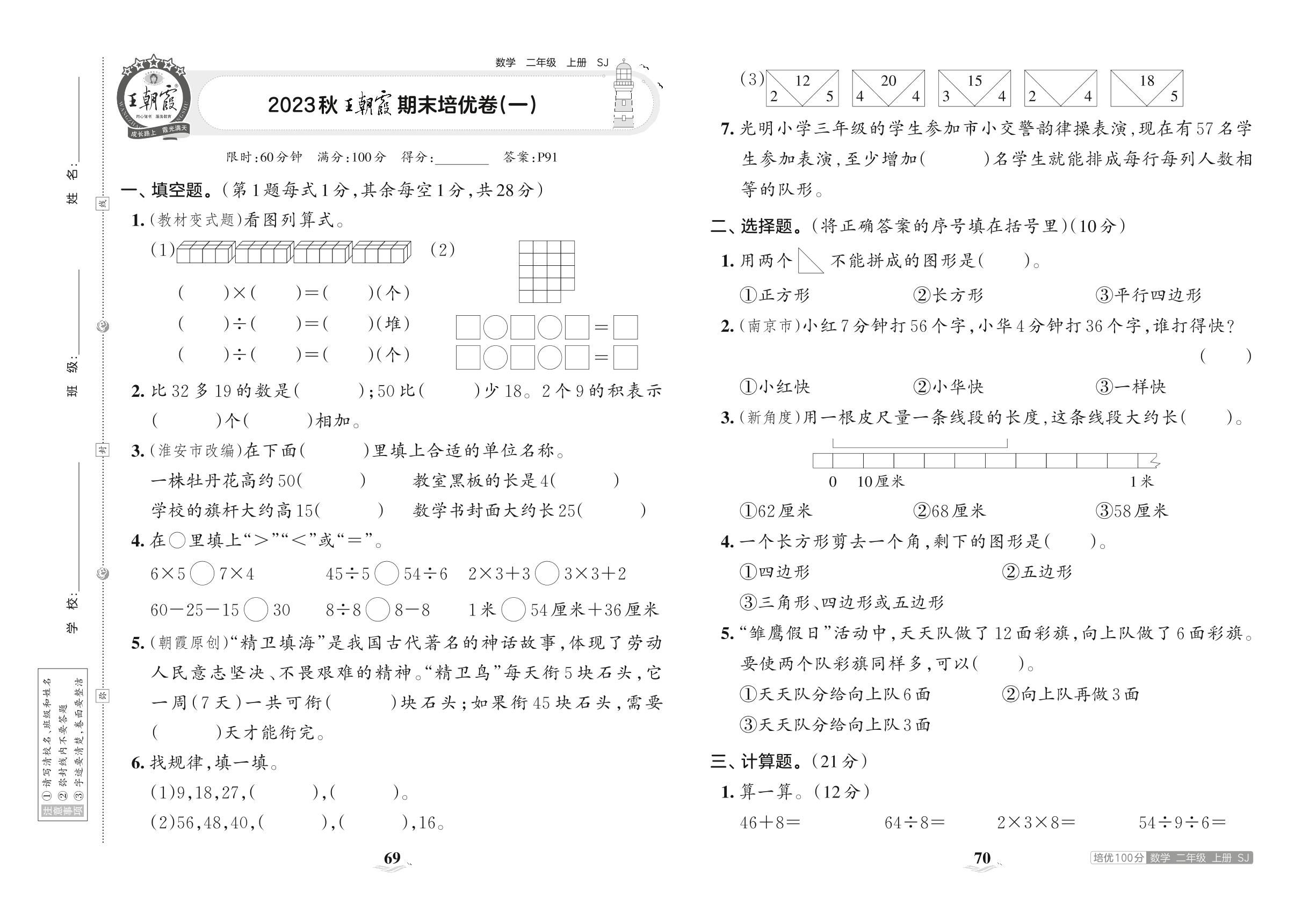 2023上册二年级数学苏教版 2023秋王朝霞期末培优卷(一)
