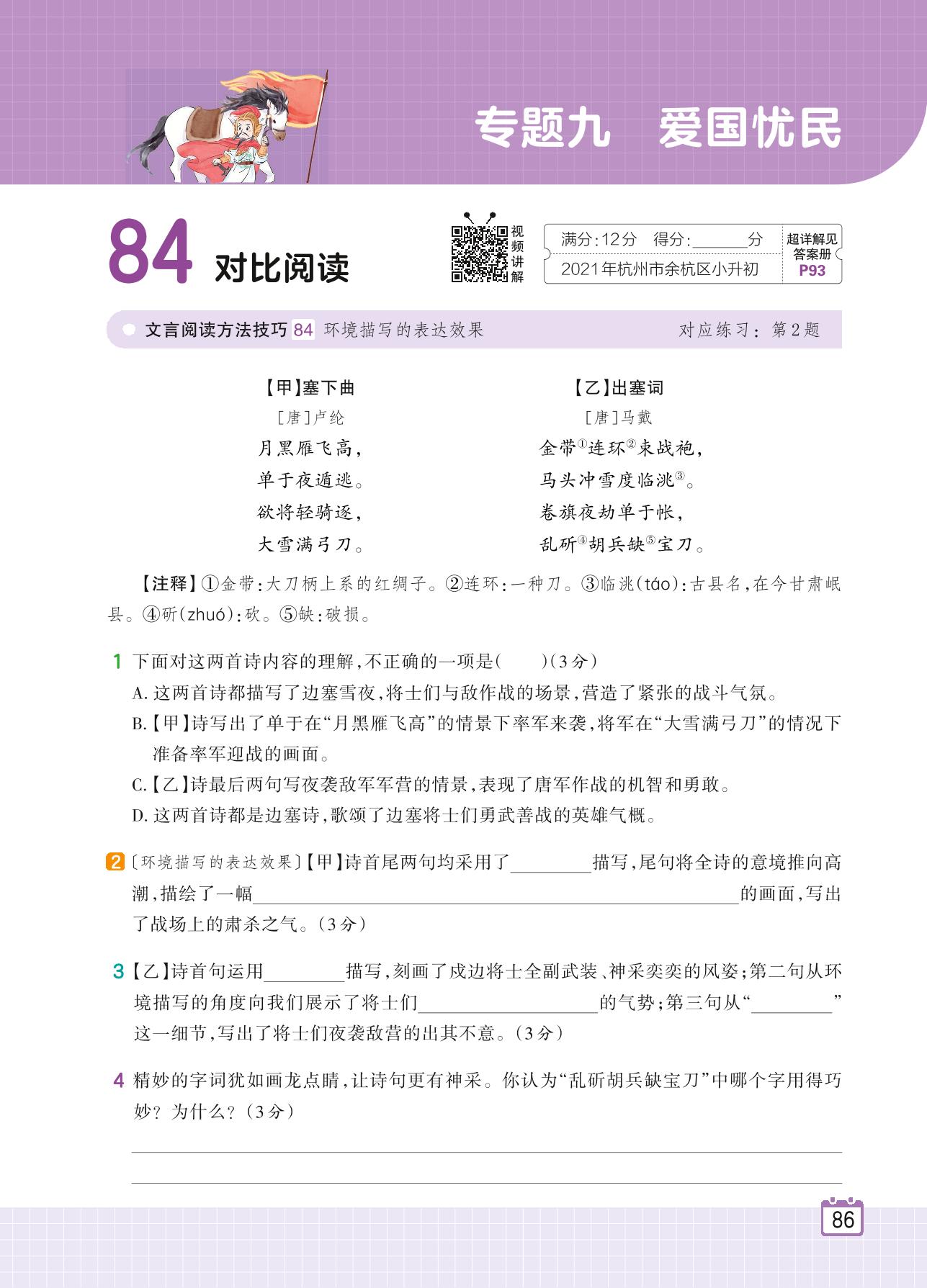 2024全一册六年级语文人教版 专题九 爱国忧民 84 对比阅读