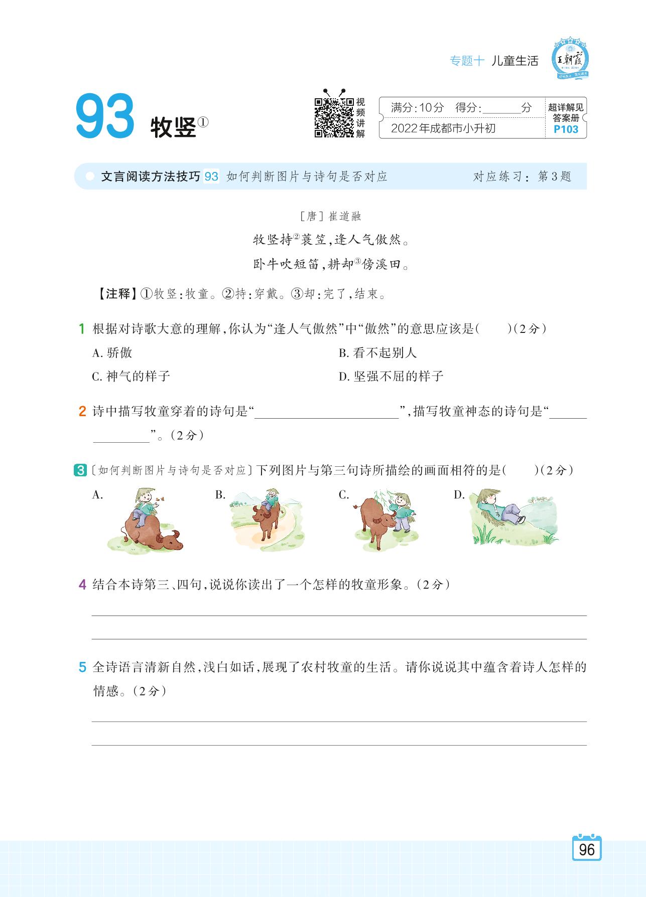 2024全一册六年级语文人教版 专题十 儿童生活 93 牧竖