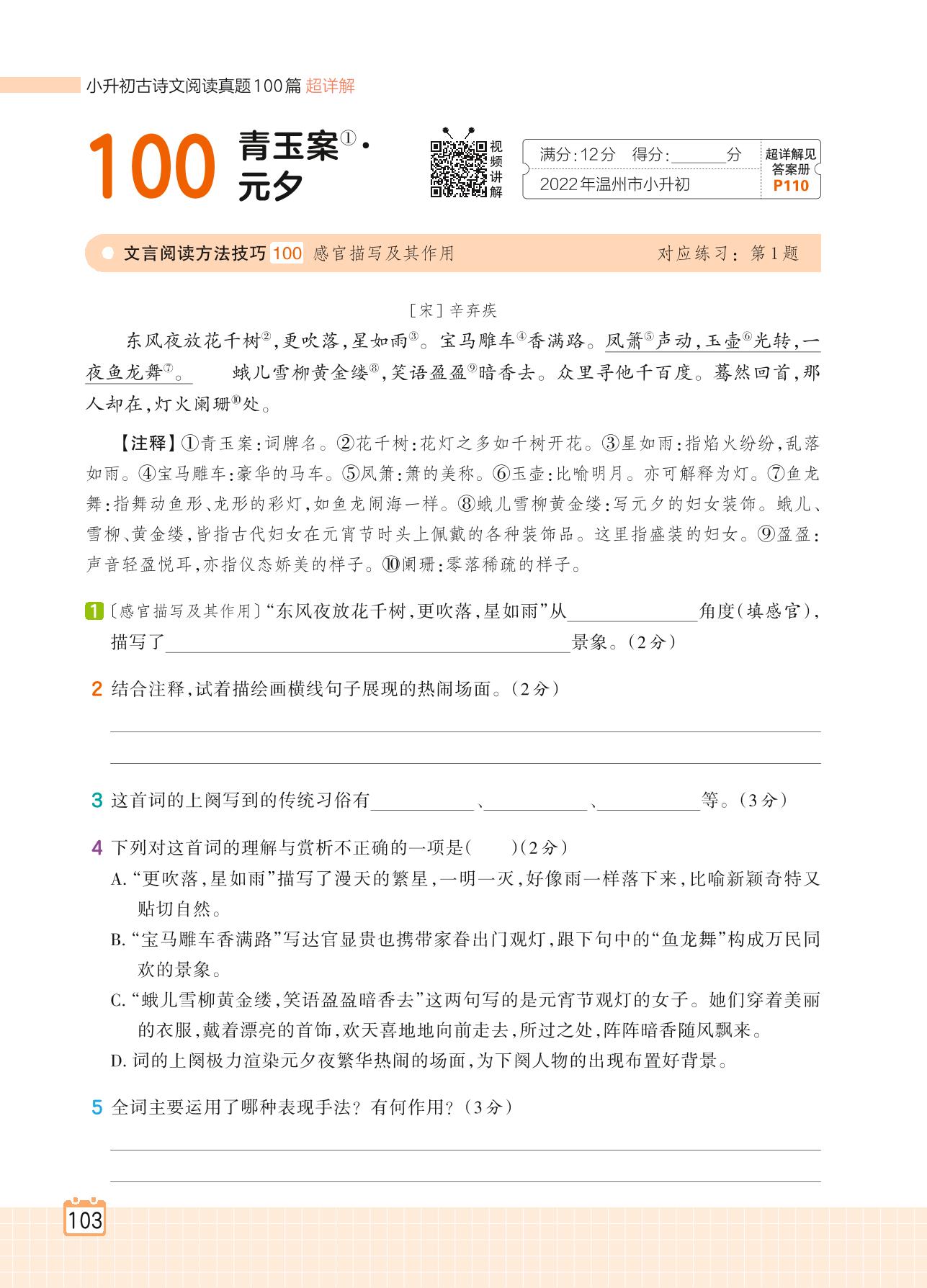 2024全一册六年级语文人教版 专题十二 节日习俗 100 青玉案·元夕