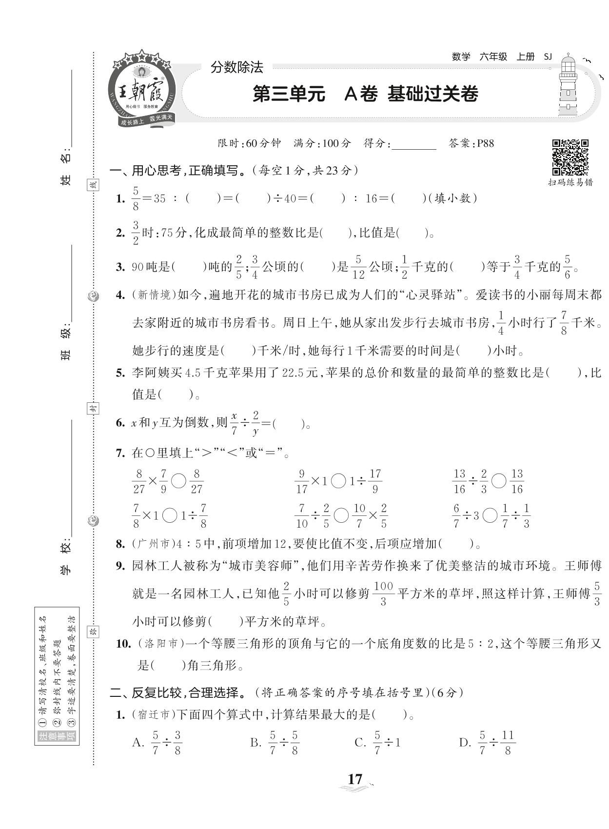 2023上册六年级数学苏教版 第三单元 A卷 基础过关卷