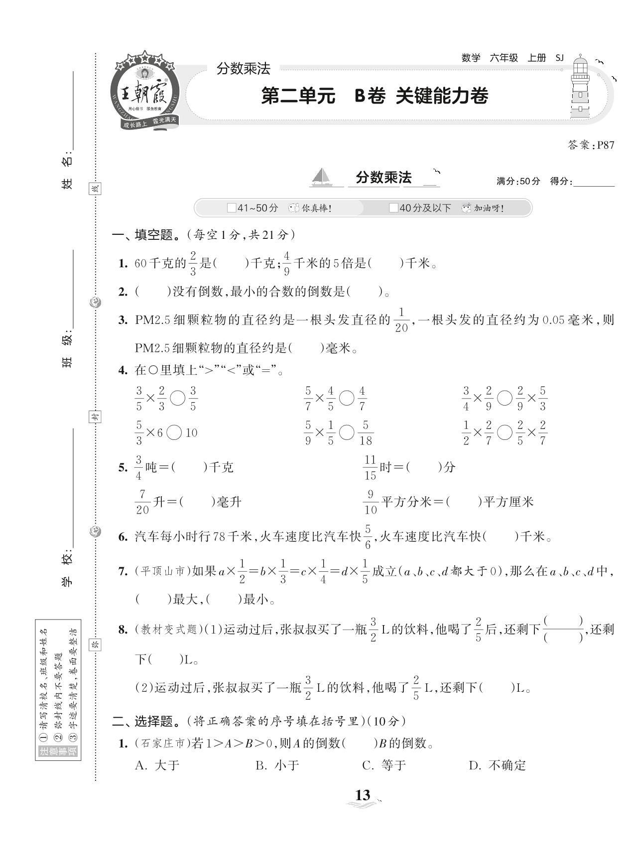 2023上册六年级数学苏教版 第二单元 B卷 关键能力卷