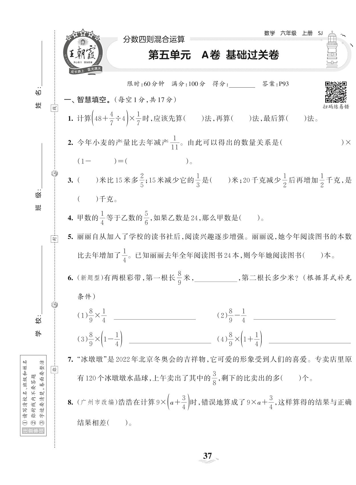 2023上册六年级数学苏教版 第五单元 A卷 基础过关卷