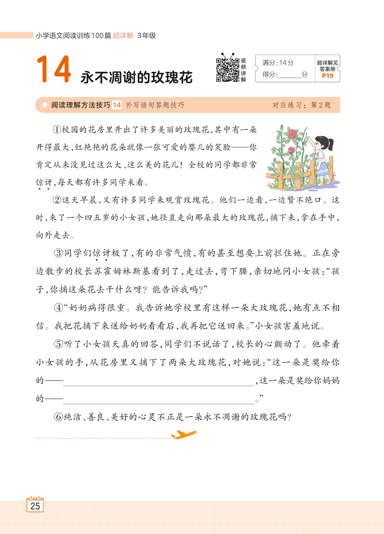 2024全一册三年级语文人教版 专题二 写事 14 永不凋谢的玫瑰花