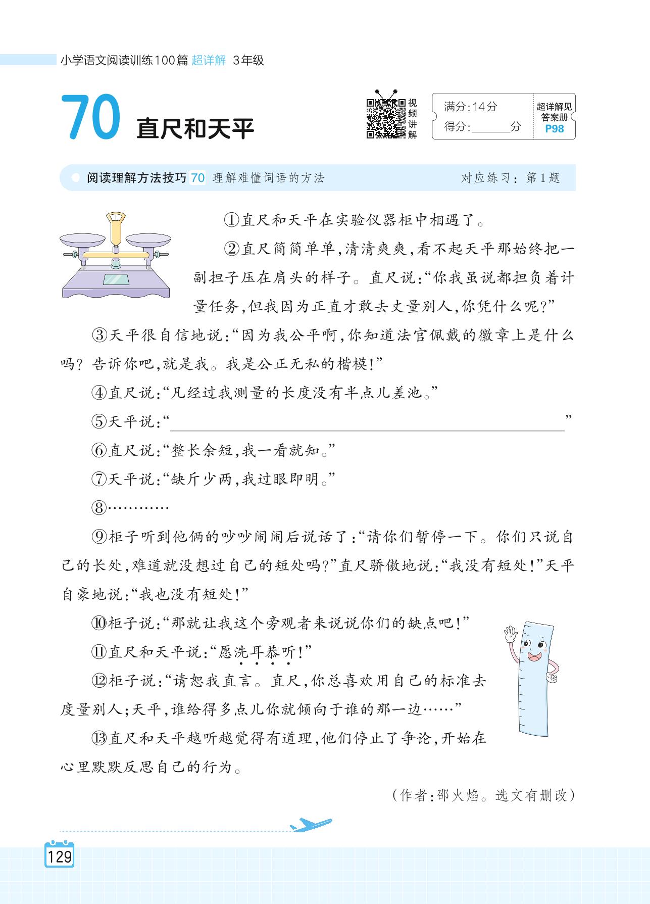 2024全一册三年级语文人教版 专题五 寓言故事 70 直尺和天平