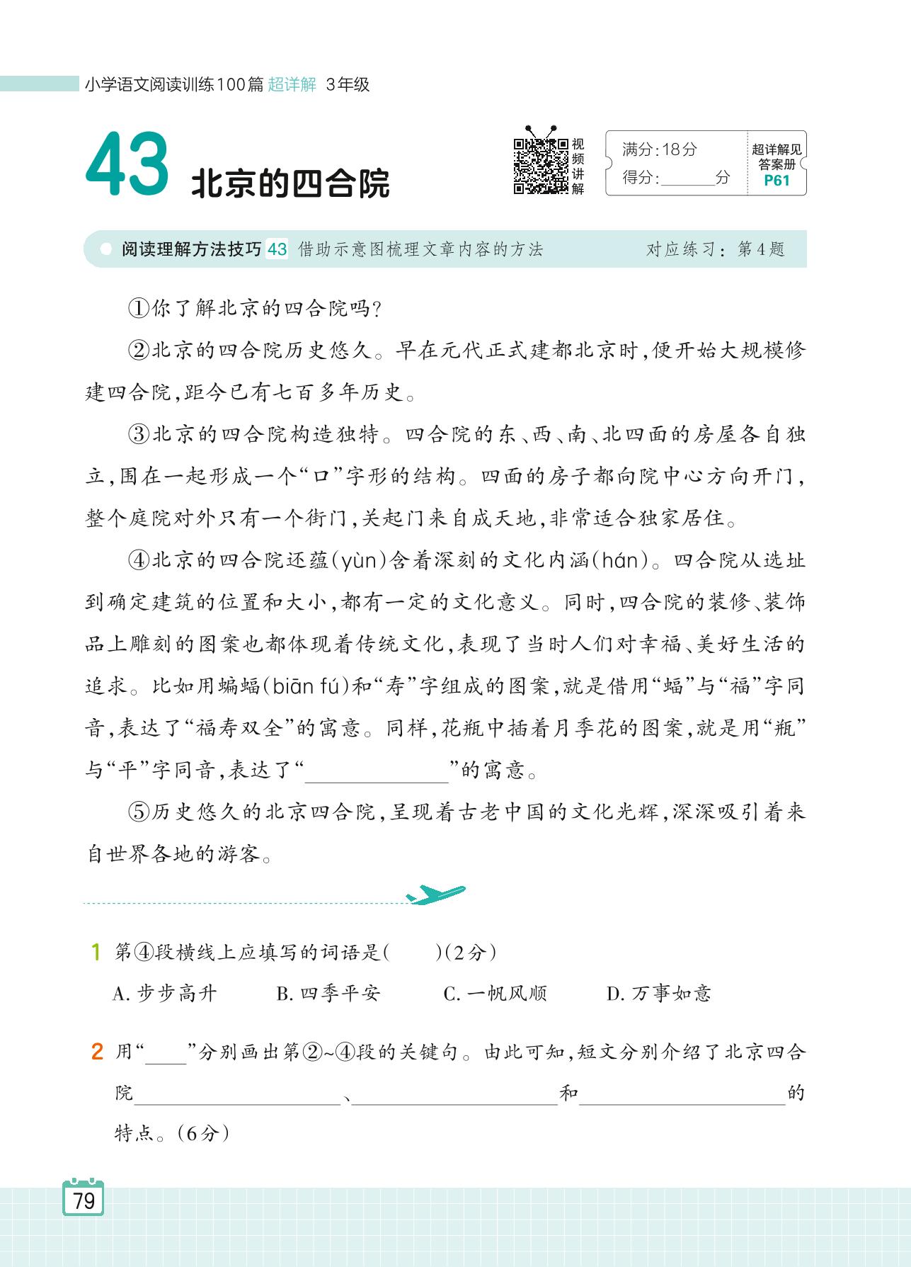 2024全一册三年级语文人教版 专题三 写景状物 43 北京的四合院