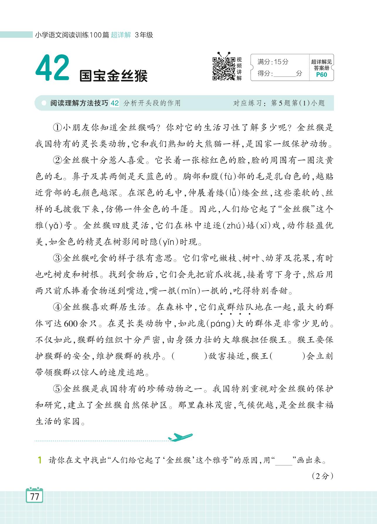 2024全一册三年级语文人教版 专题三 写景状物 42 国宝金丝猴