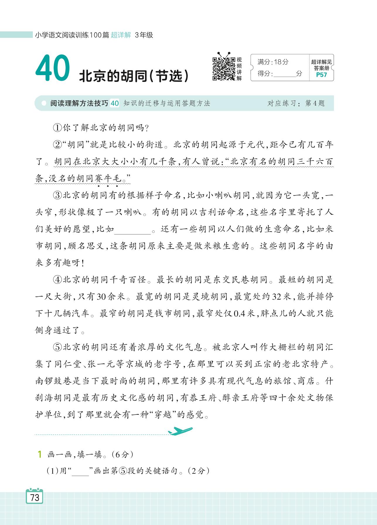 2024全一册三年级语文人教版 专题三 写景状物 40 北京的胡同 (节选)
