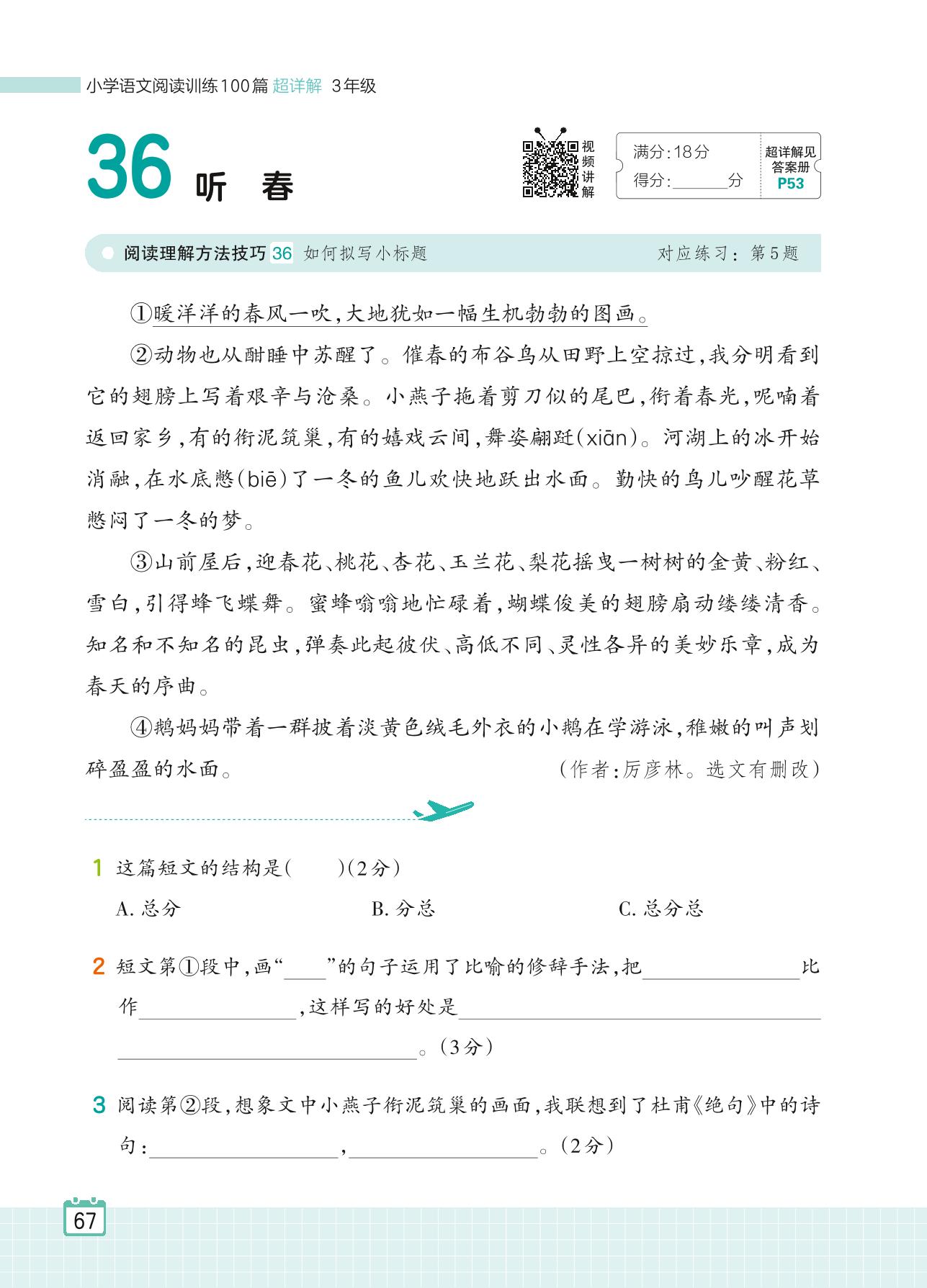 2024全一册三年级语文人教版 专题三 写景状物 36 听春