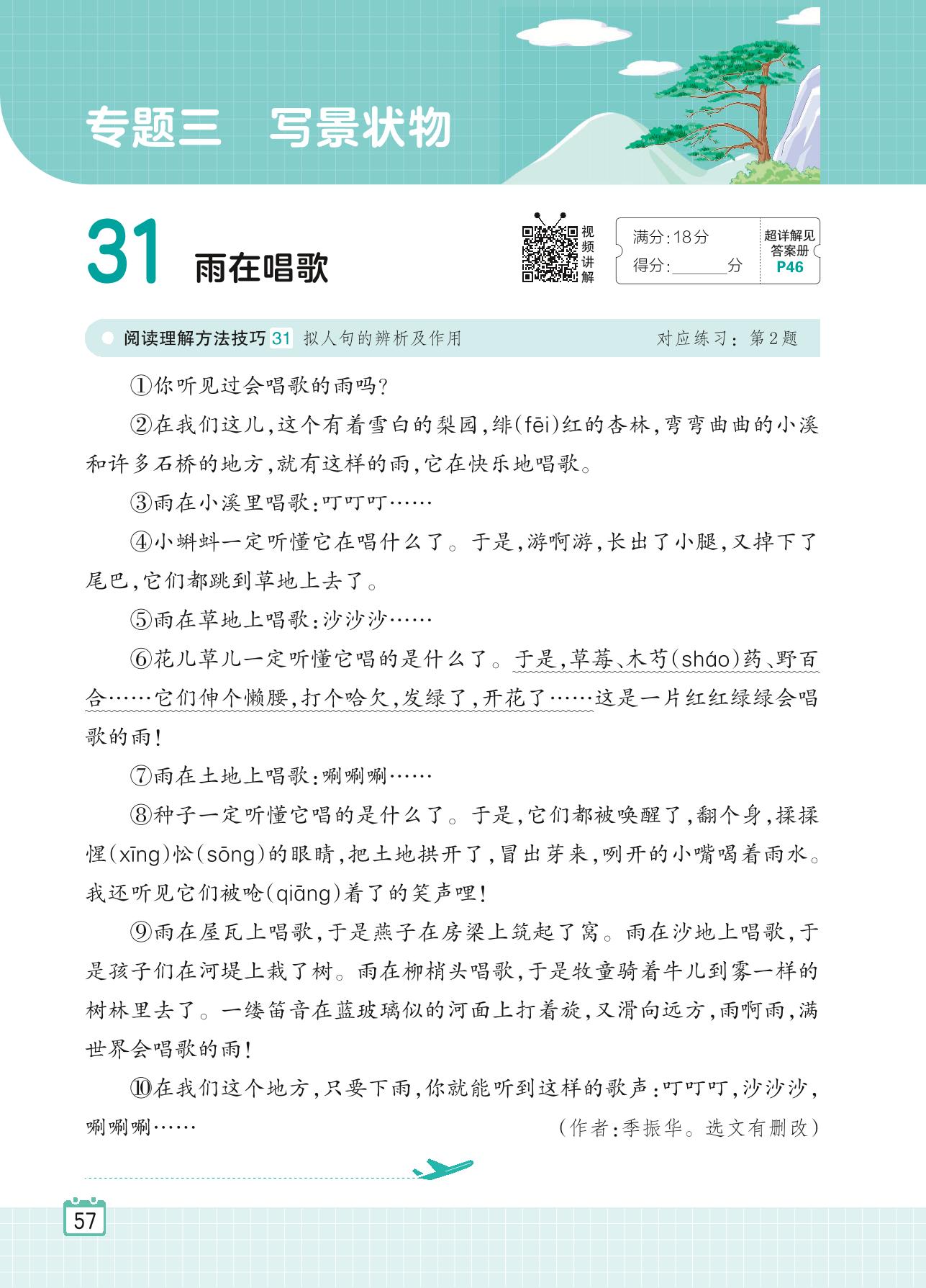 2024全一册三年级语文人教版 专题三 写景状物 31 雨在唱歌