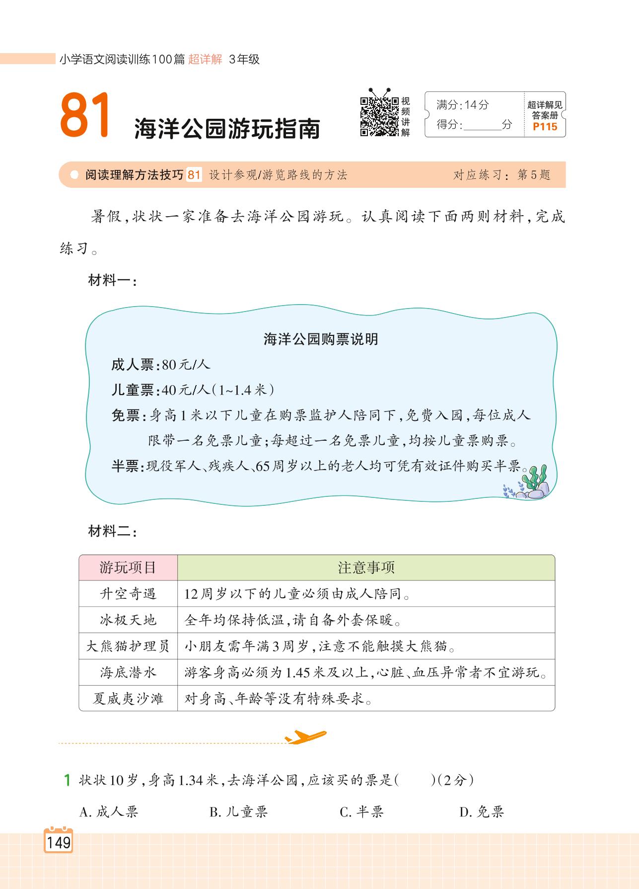 2024全一册三年级语文人教版 专题七 非连续性文本 81 海洋公园游玩指南