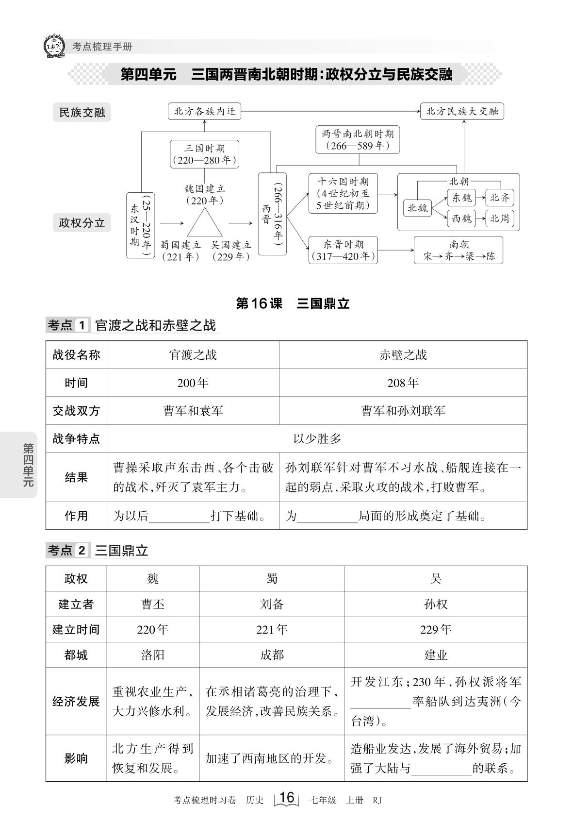 2023上册七年级历史人教版 考点梳理手册——第四单元 三国两晋南北朝时期:政权分立与民族交融