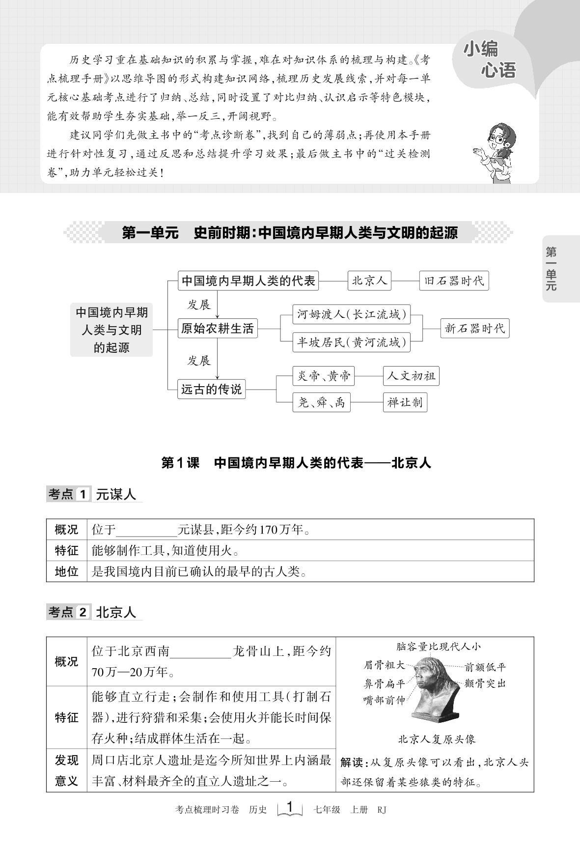 2023上册七年级历史人教版 考点梳理手册——第一单元 史前时期:中国境内早期人类与文明的起源