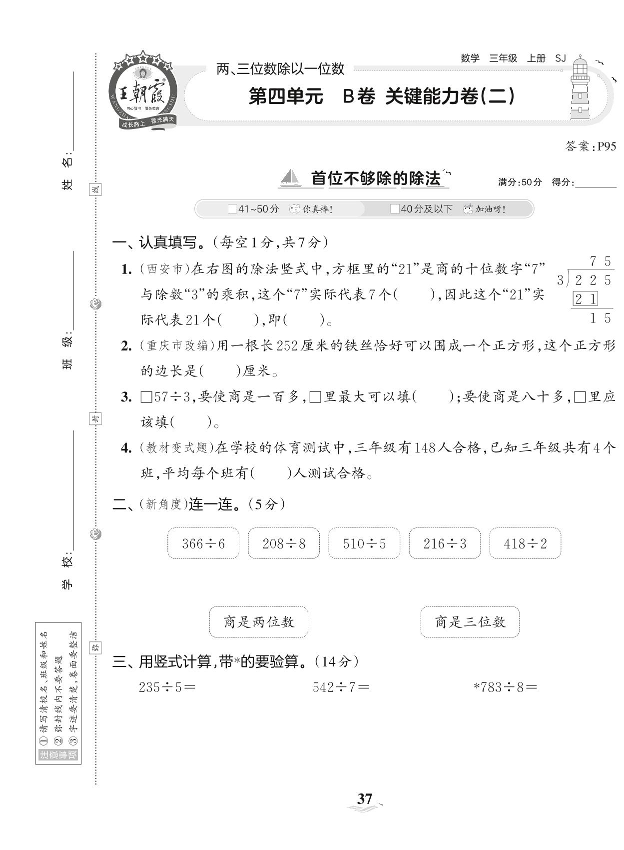 2023上册三年级数学苏教版 第四单元 B卷 关键能力卷(二)