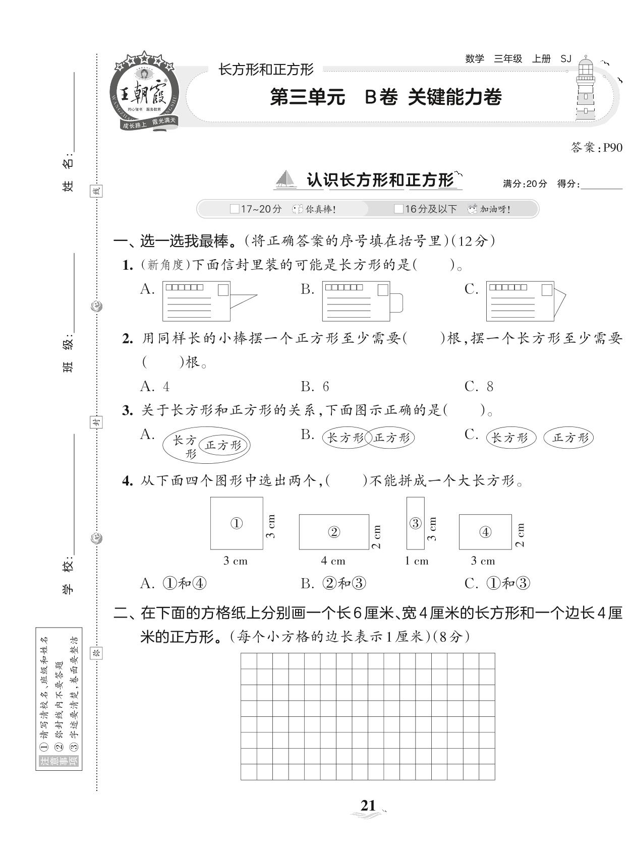 2023上册三年级数学苏教版 第三单元 B卷 关键能力卷