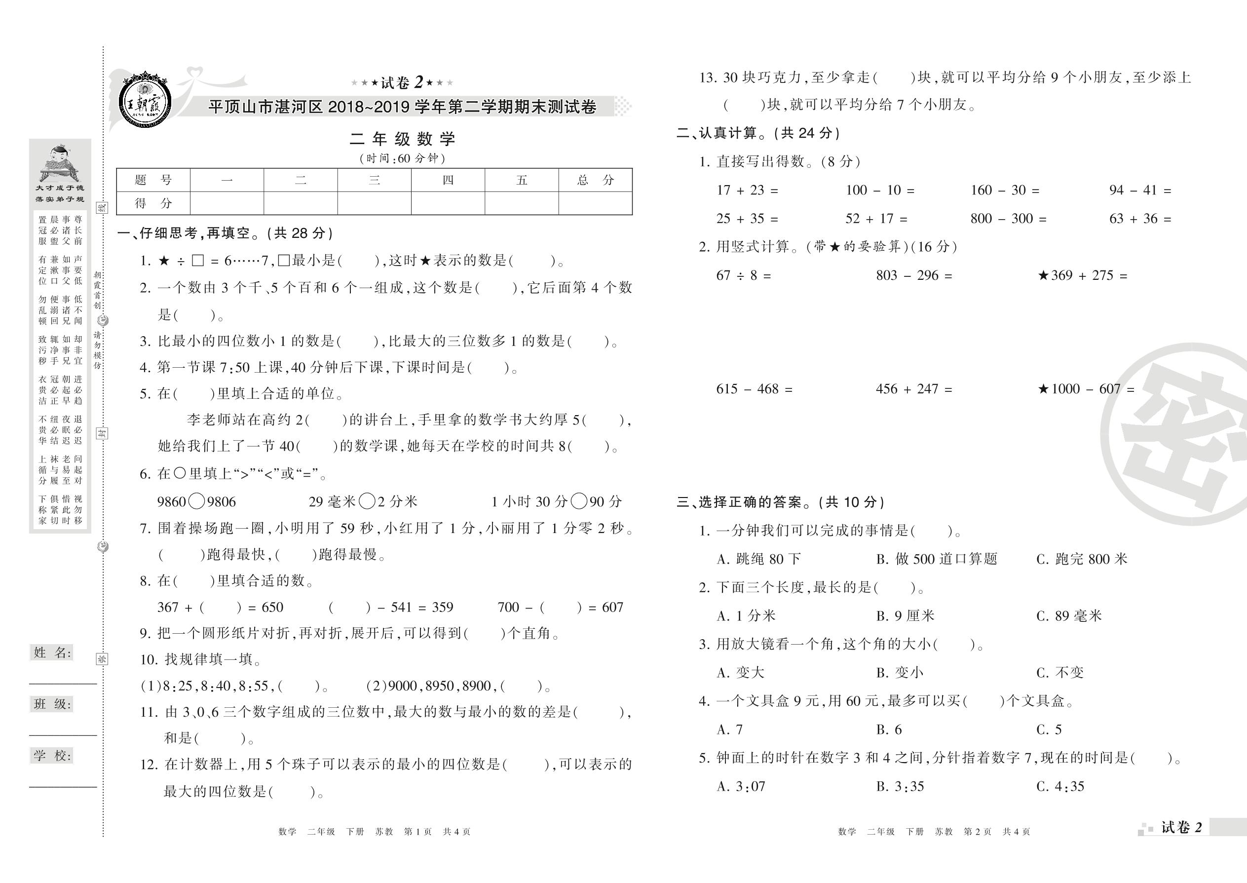 2018-2019学年第二学期平顶山市湛河区二年级数学试卷(苏教版)【2】